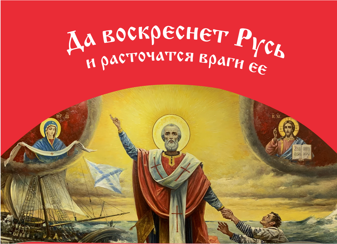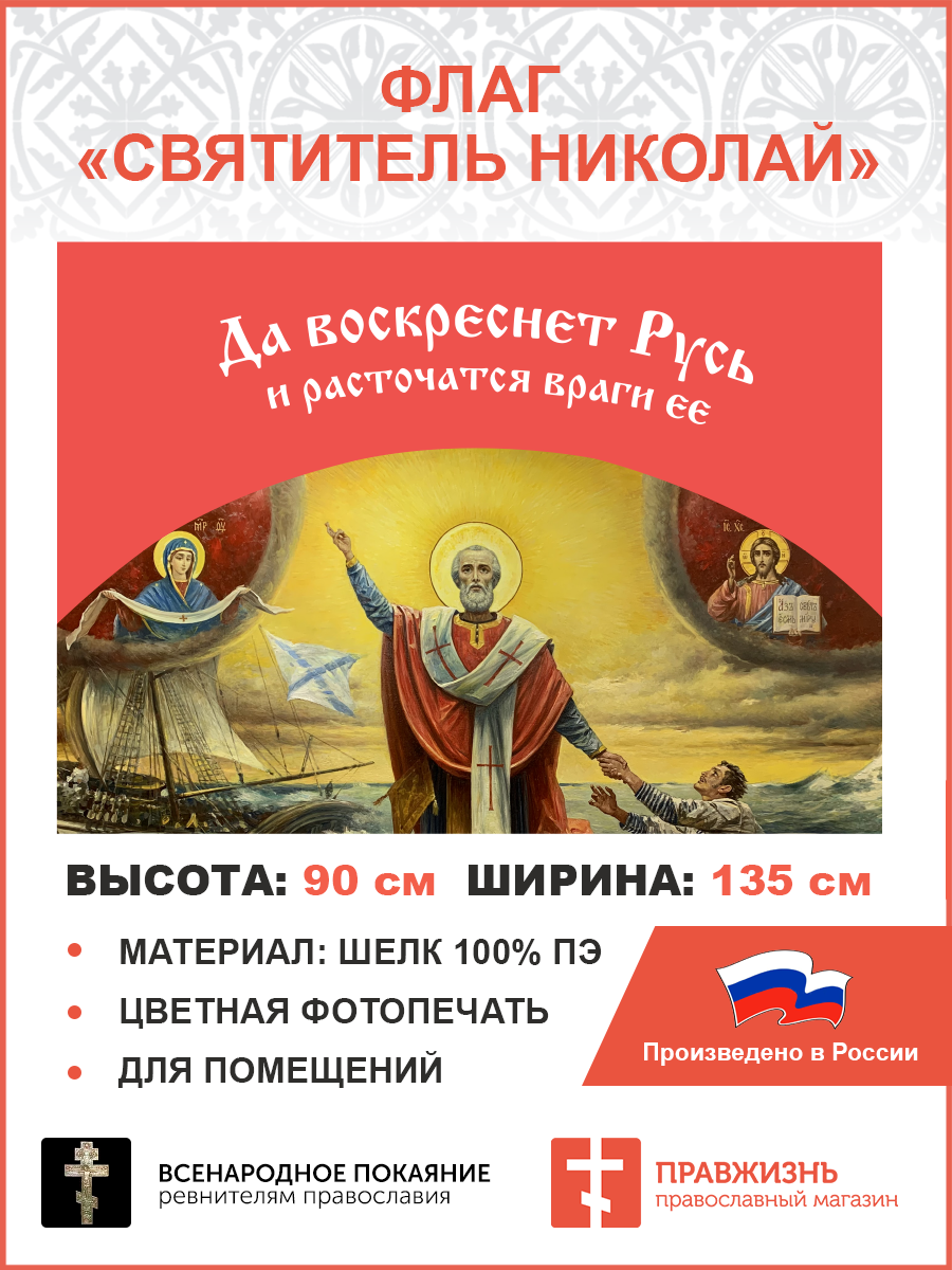 Флаг 034 Святитель Николай, да воскреснет Русь на красном, 90х135 см, материал шелк для помещений