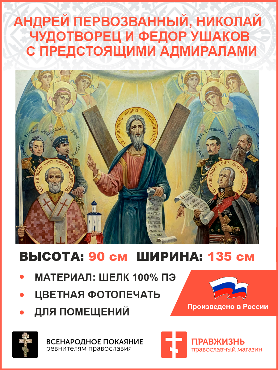 Флаг 047 Андрей Первозванный, Николай Чудотворец и Федор Ушаков с предстоящими адмиралами, 90х135 см, материал шелк для помещений