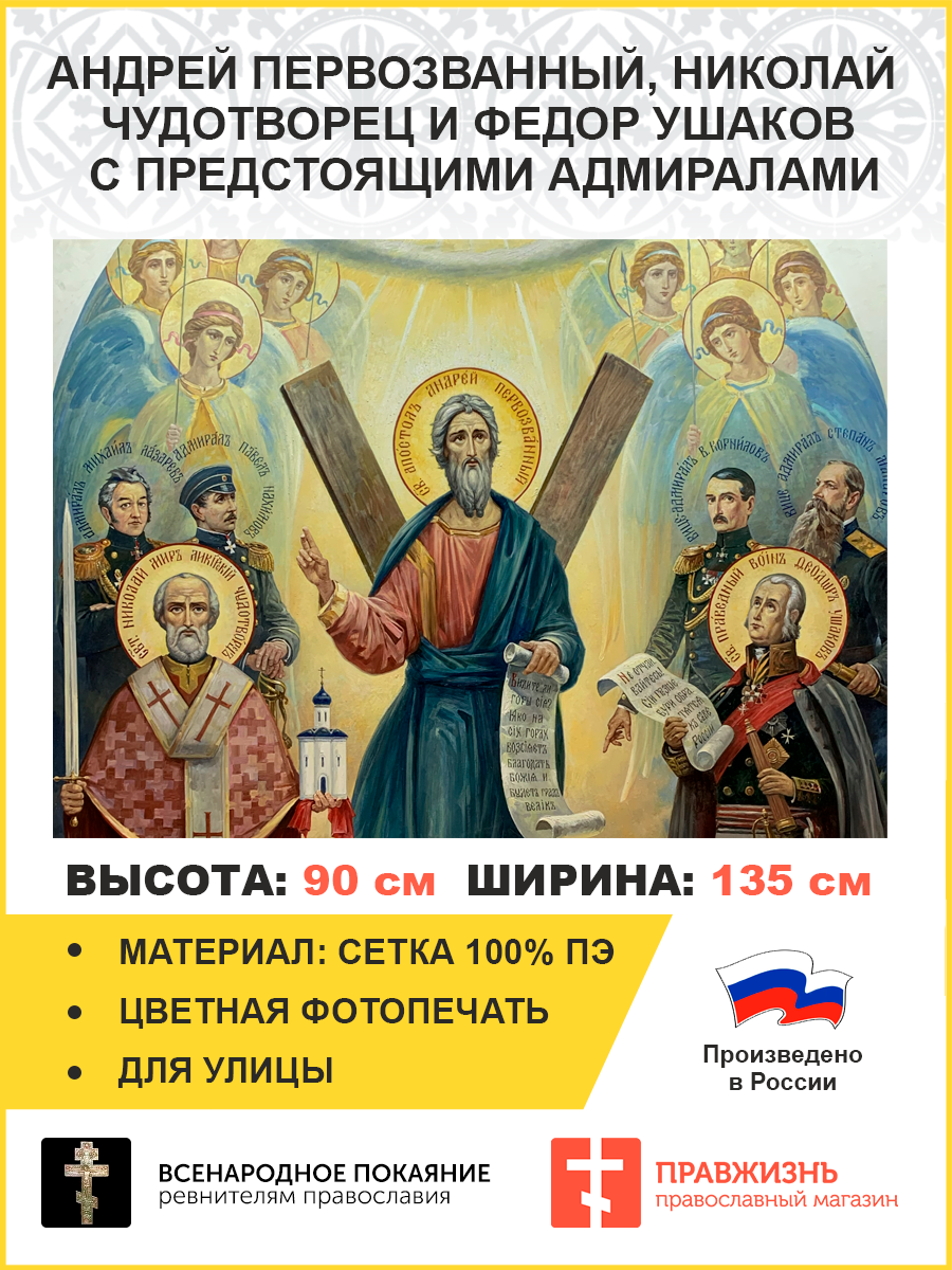 Флаг 047 Андрей Первозванный, Николай Чудотворец и Федор Ушаков с предстоящими адмиралами, 90х135 см, материал сетка для улицы