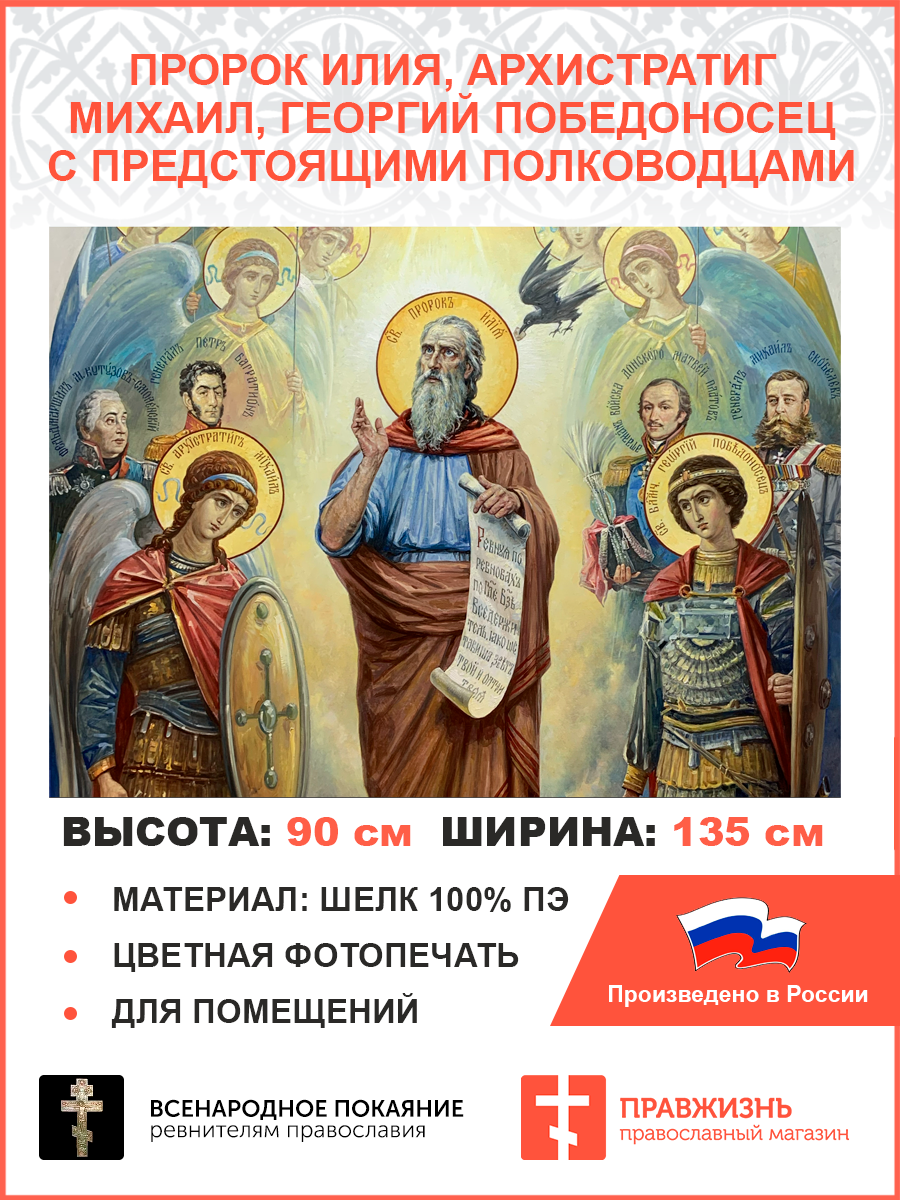 Флаг 048 Пророк Илия, Архистратиг Михаил, Георгий победоносец с предстоящими полководцами, 90х135 см, материал шелк для помещений