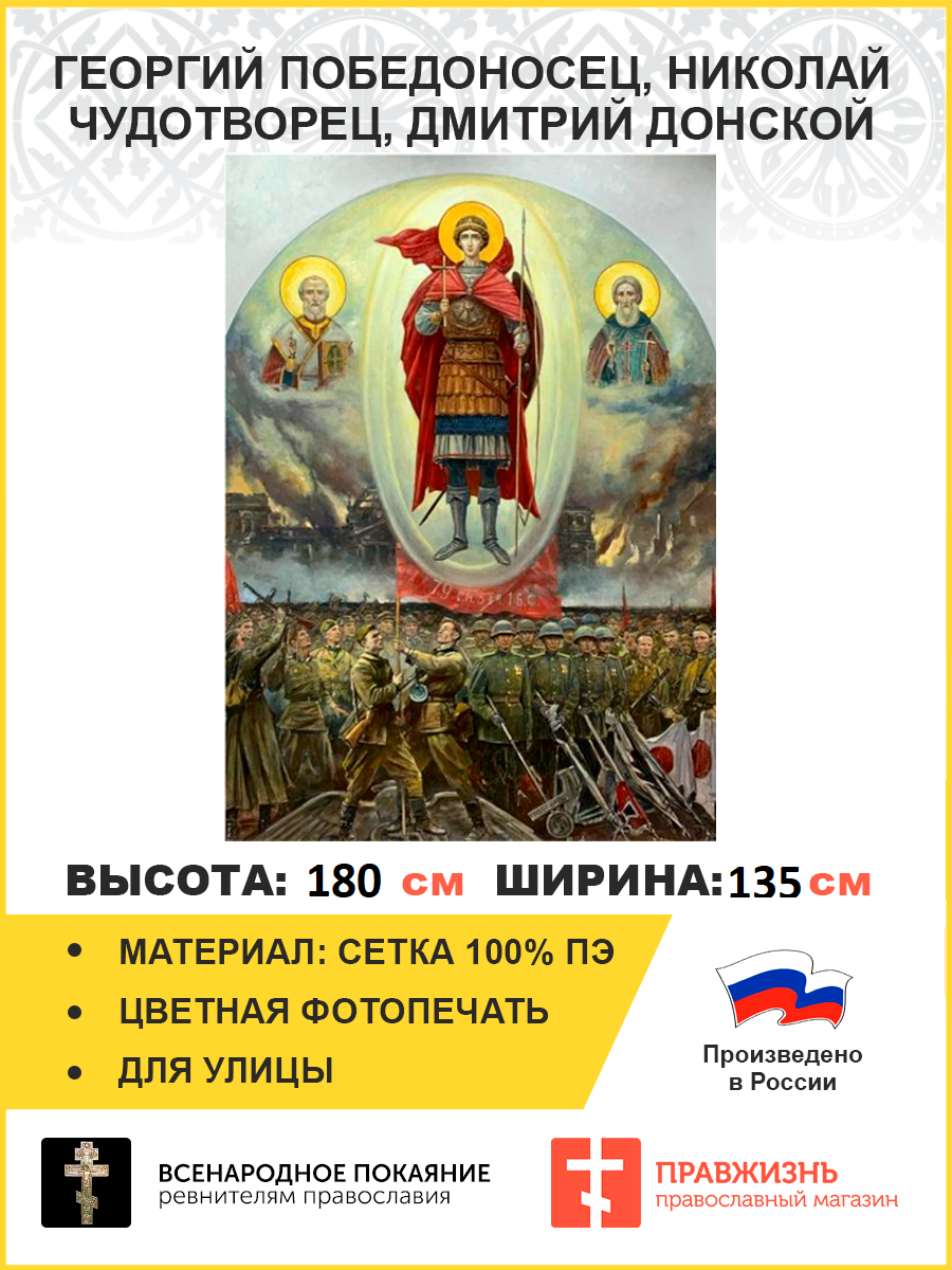 Флаг 050 Георгий Победоносец, Николай Чудотворец, Дмитрий Донской с войнами победителями, 180х135 см, материал сетка для улицы