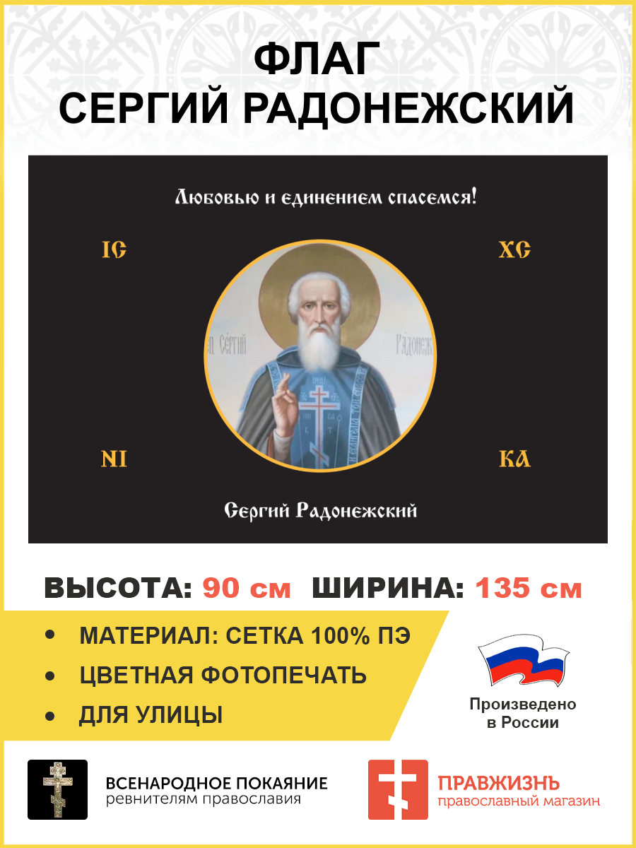 Флаг 164 Сергий Радонежский Любовью и единением спасемся черный 90х135 материал сетка для улицы