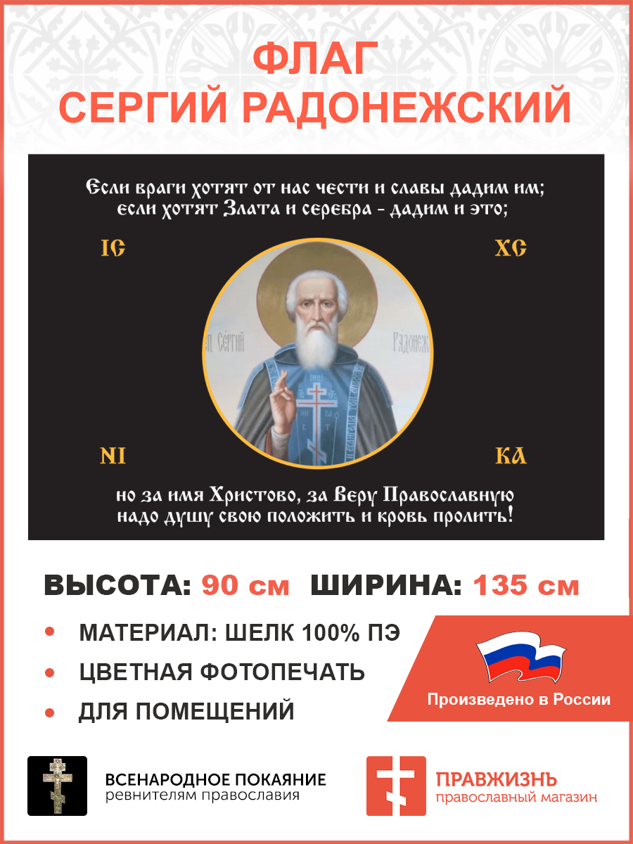Флаг 166 Сергий Радонежский За Веру Православную надо душу свою положить черный 90х135, материал шелк для помещений