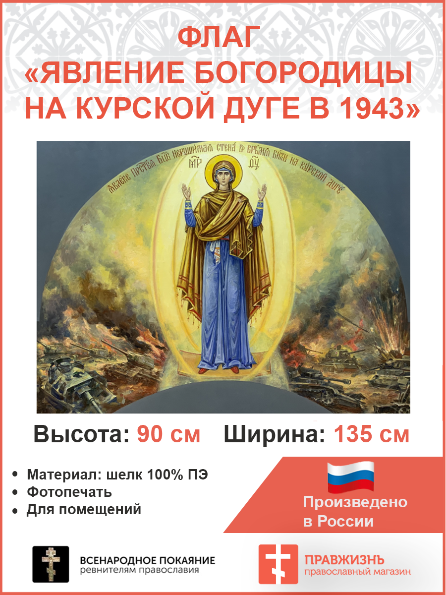 Флаг 032 Явление Богородицы на Курской дуге в 1943 на сером, 90х135 см, материал шелк для помещений