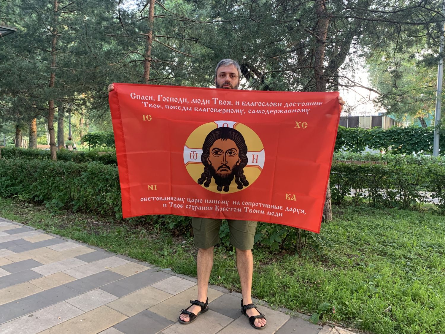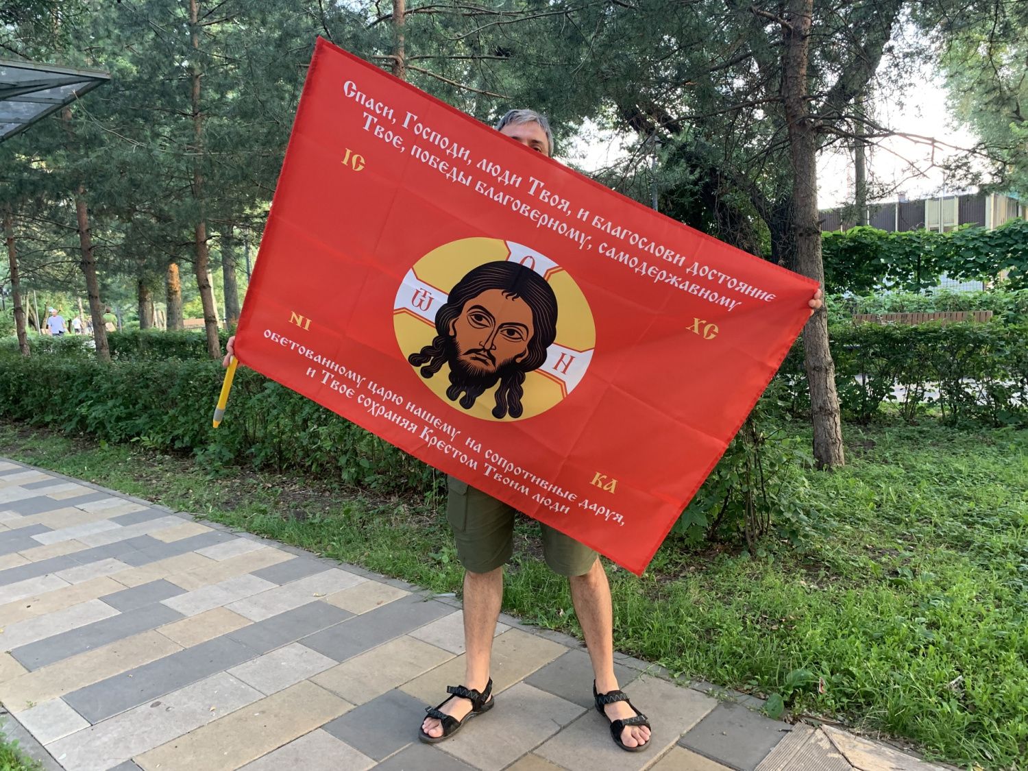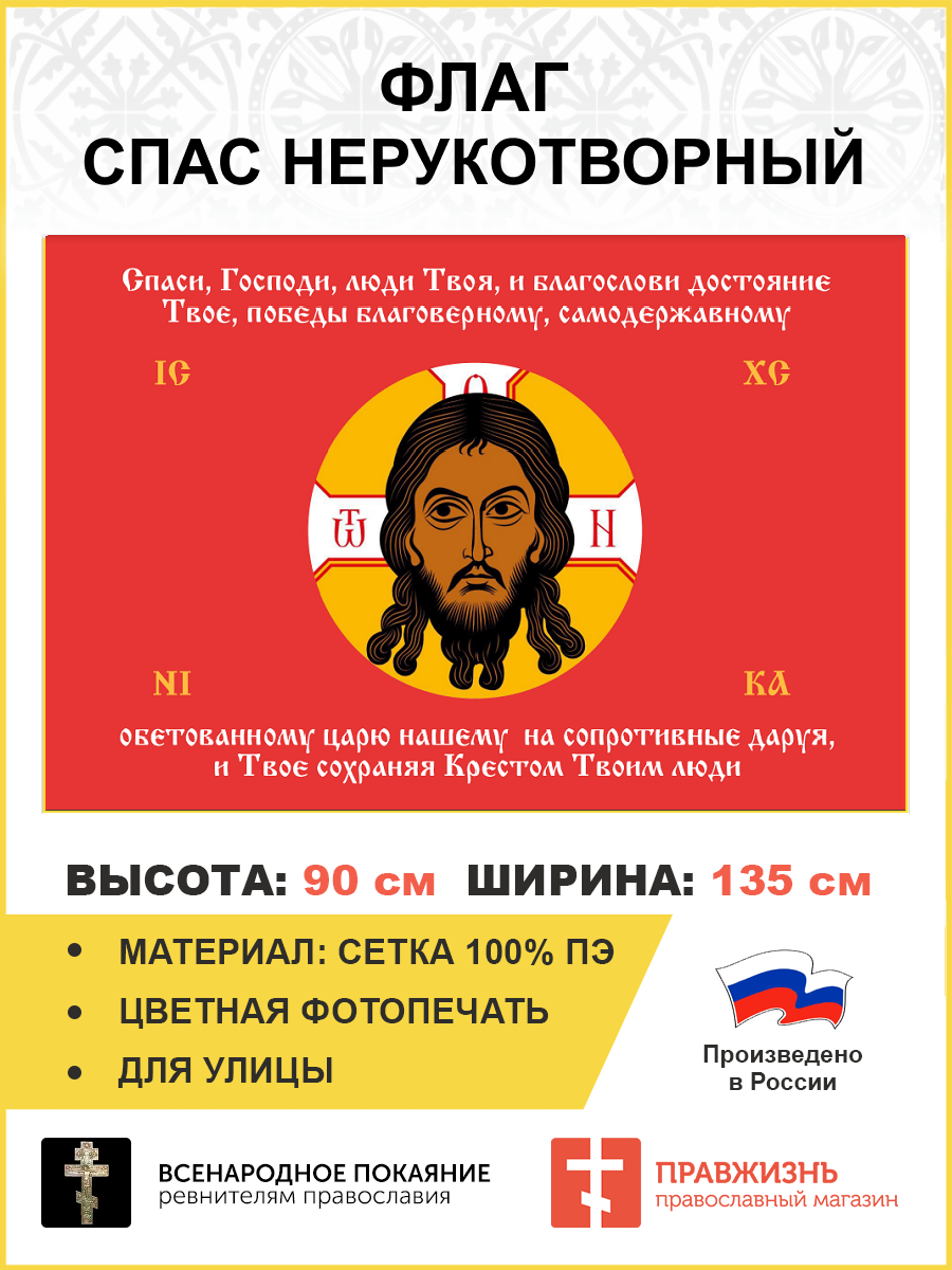Флаг 198 Спас Нерукотворный Спаси Господи люди Твоя на красном 90х135 материал сетка для улицы