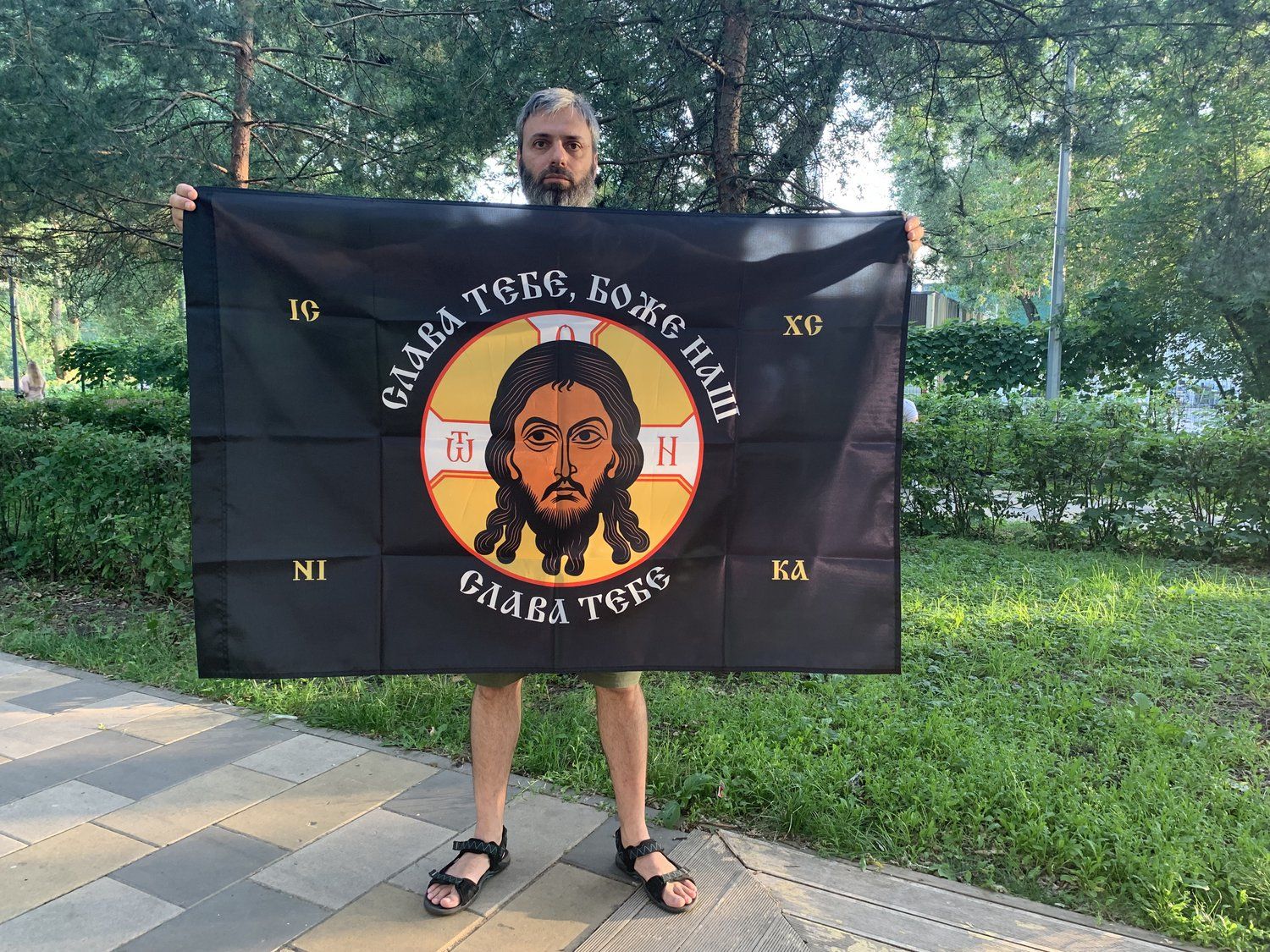 Флаг 203 Спас Нерукотворный Слава Тебе Боже наш на черном 90х135 материал сетка для улицы