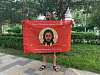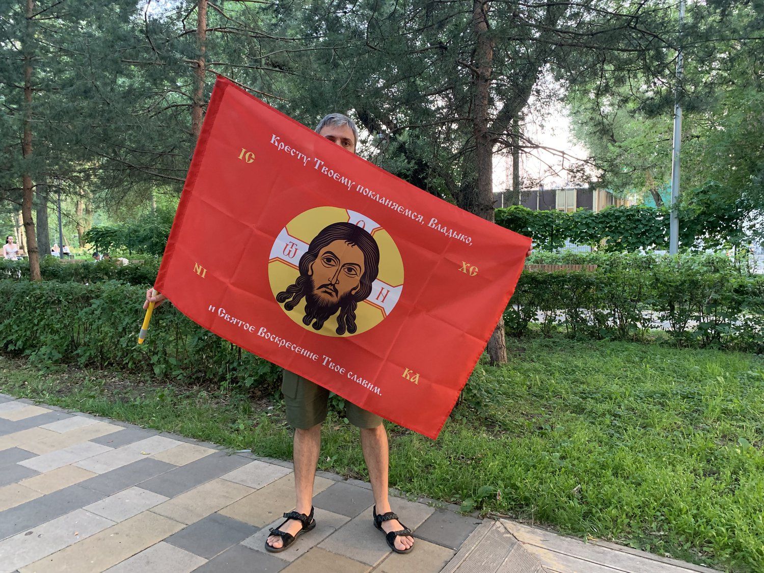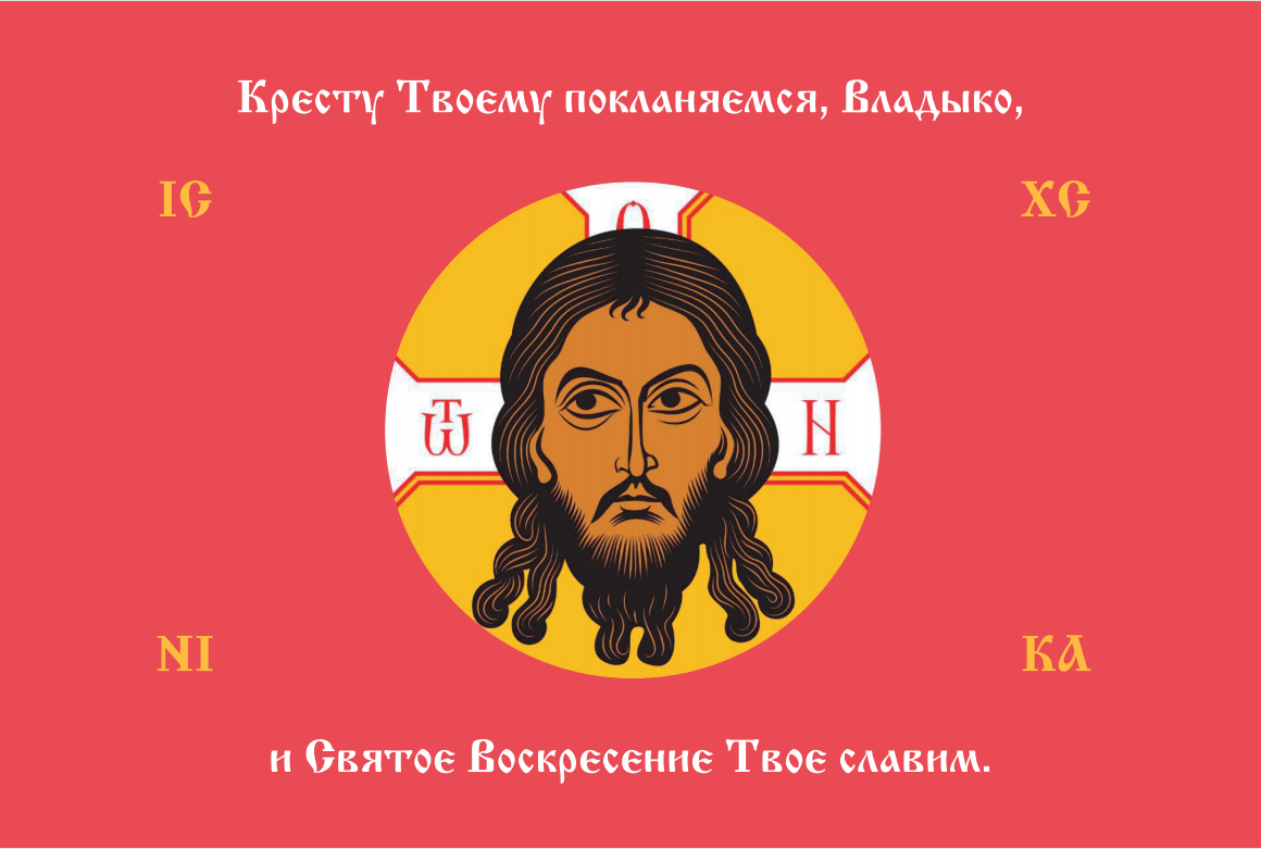Флаг 207 Спас Нерукотворный Кресту Твоему поклоняемся на красном 90х135 материал шелк для помещений