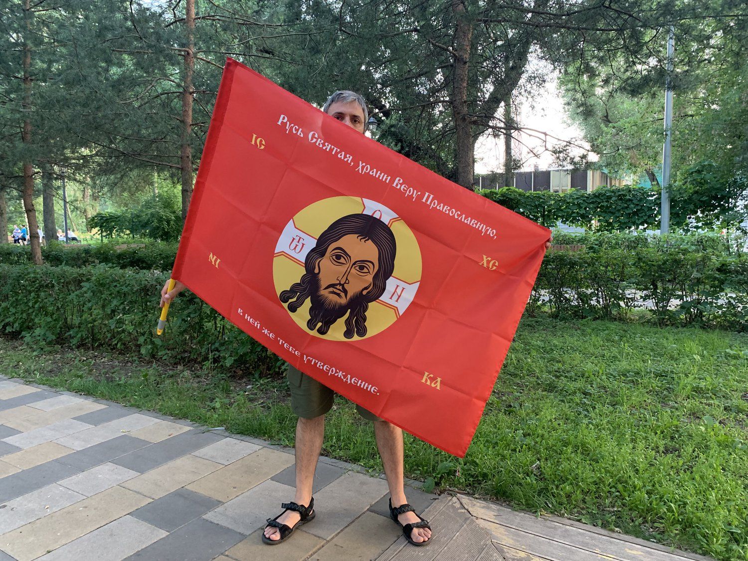 Флаг 216 Спас Нерукотворный Русь Святая храни Веру Православную на красном 90х135 материал сетка для