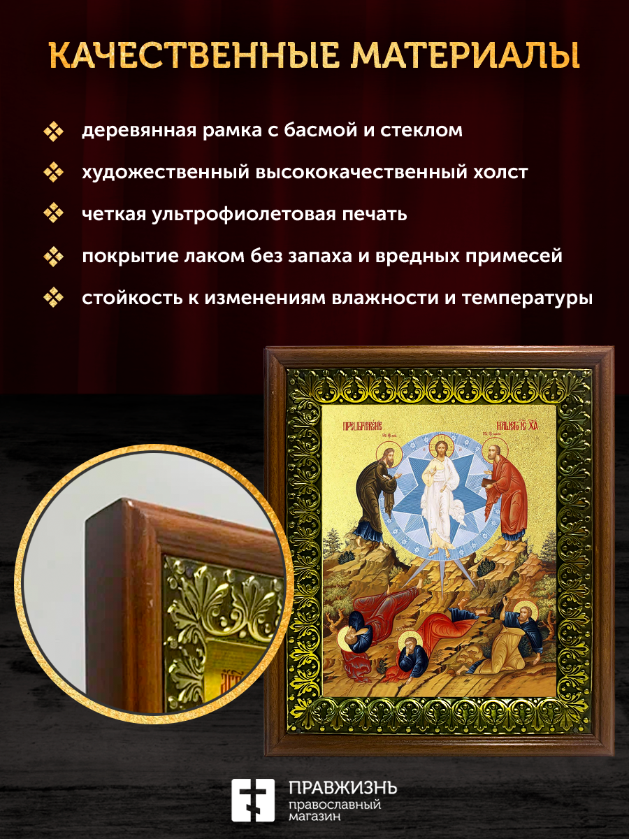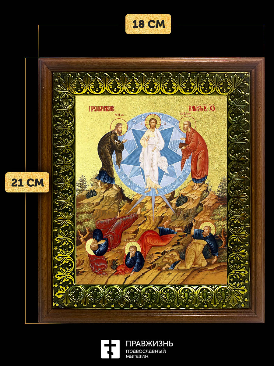 Икона Преображение Господне с золочением, деревянная рамка с басмой и стеклом 18х21х2,5 см 1230