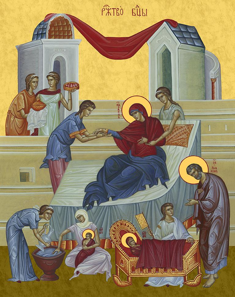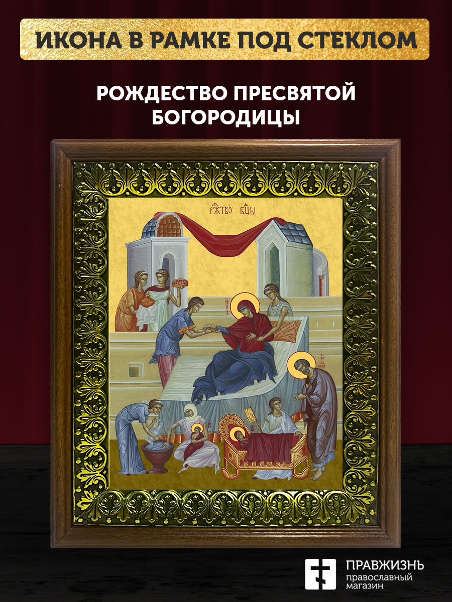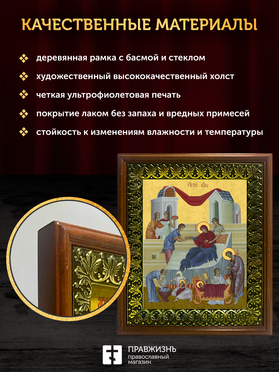 Икона Рождество Пресвятой Богородицы, деревянная рамка с басмой и стеклом 18х21х2,5 см 1128
