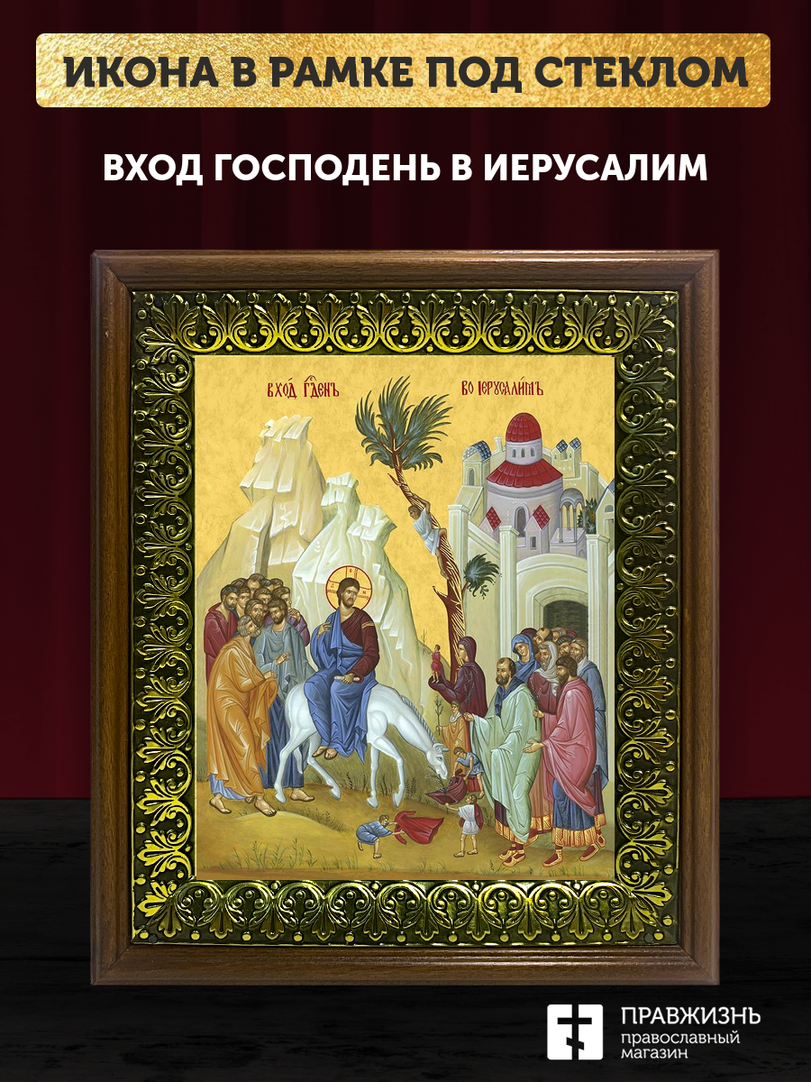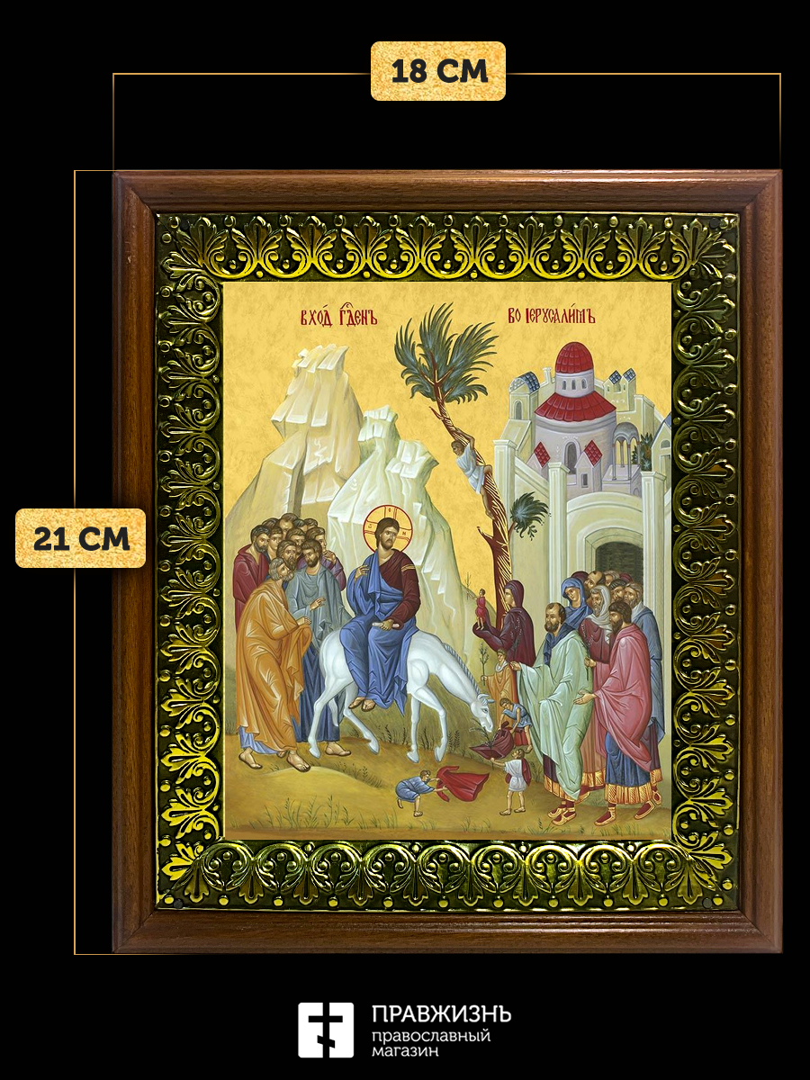 Икона Вход Господень в Иерусалим, деревянная рамка с басмой и стеклом 18х21х2,5 см 1208