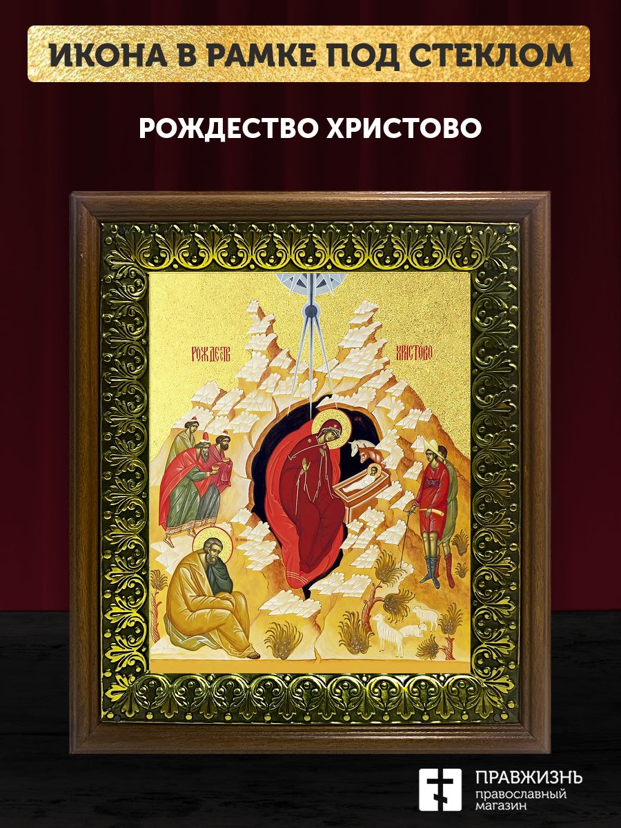 Икона Рождество Христово с золочением, деревянная рамка с басмой и стеклом 18х21х2,5 см 1143
