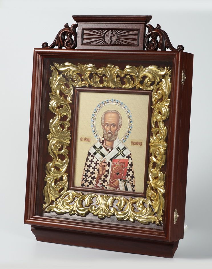 Киот-липа, резное навершие и подзор,.резной подрамник поталь, икона фото, объемная печать, стекло
