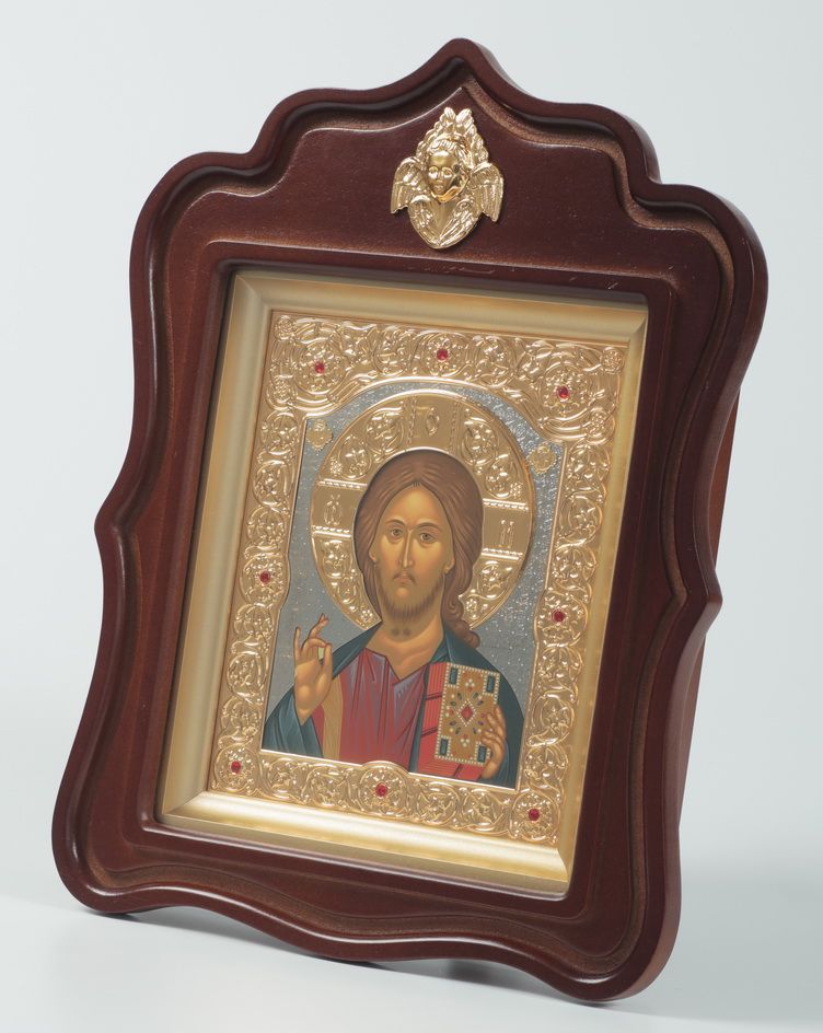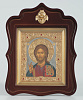 Икона в киоте 18х24 фигурный с навершием, темпера, риза объемная, золочение, никелир, без цаты Спаситель