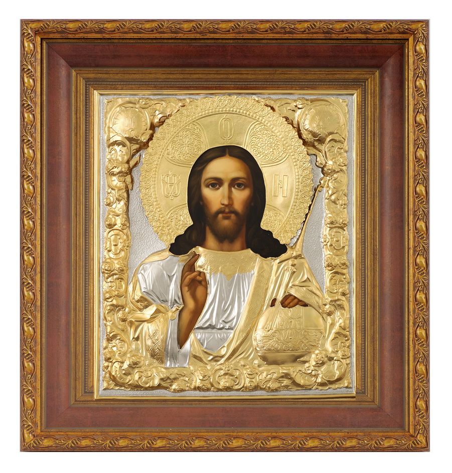 Икона живописная в киоте 24х30 масло, риза № 76, матовое золочение, киот №22 Спаситель
