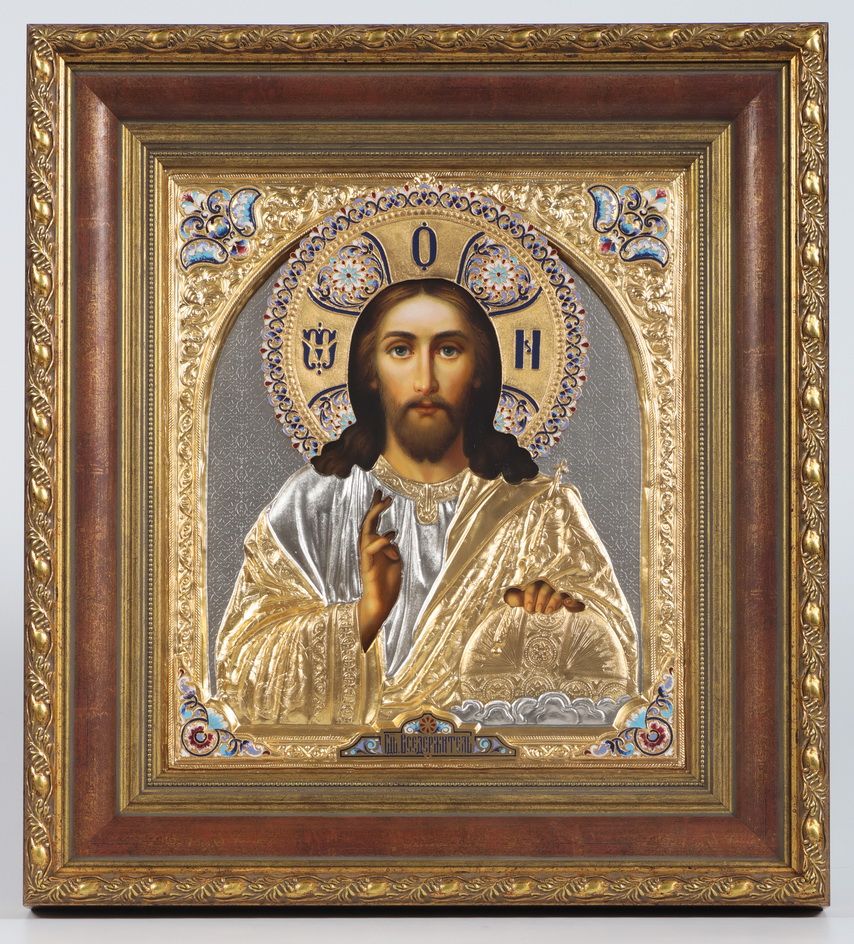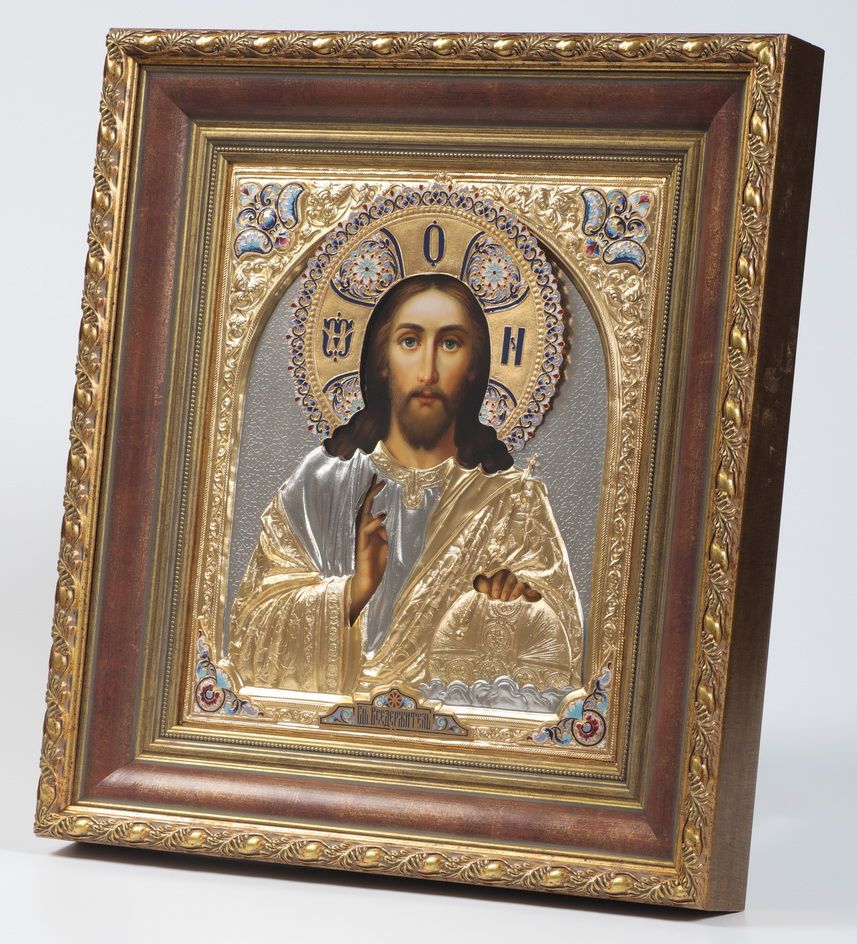 Икона живописная в киоте 30х40 масло, риза №33, матовое золочение, эмаль, киот №22 Спаситель