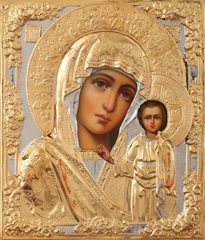 Икона живописная в ризе 24х30 масло, объемная риза № 17, золочение Казанская БМ