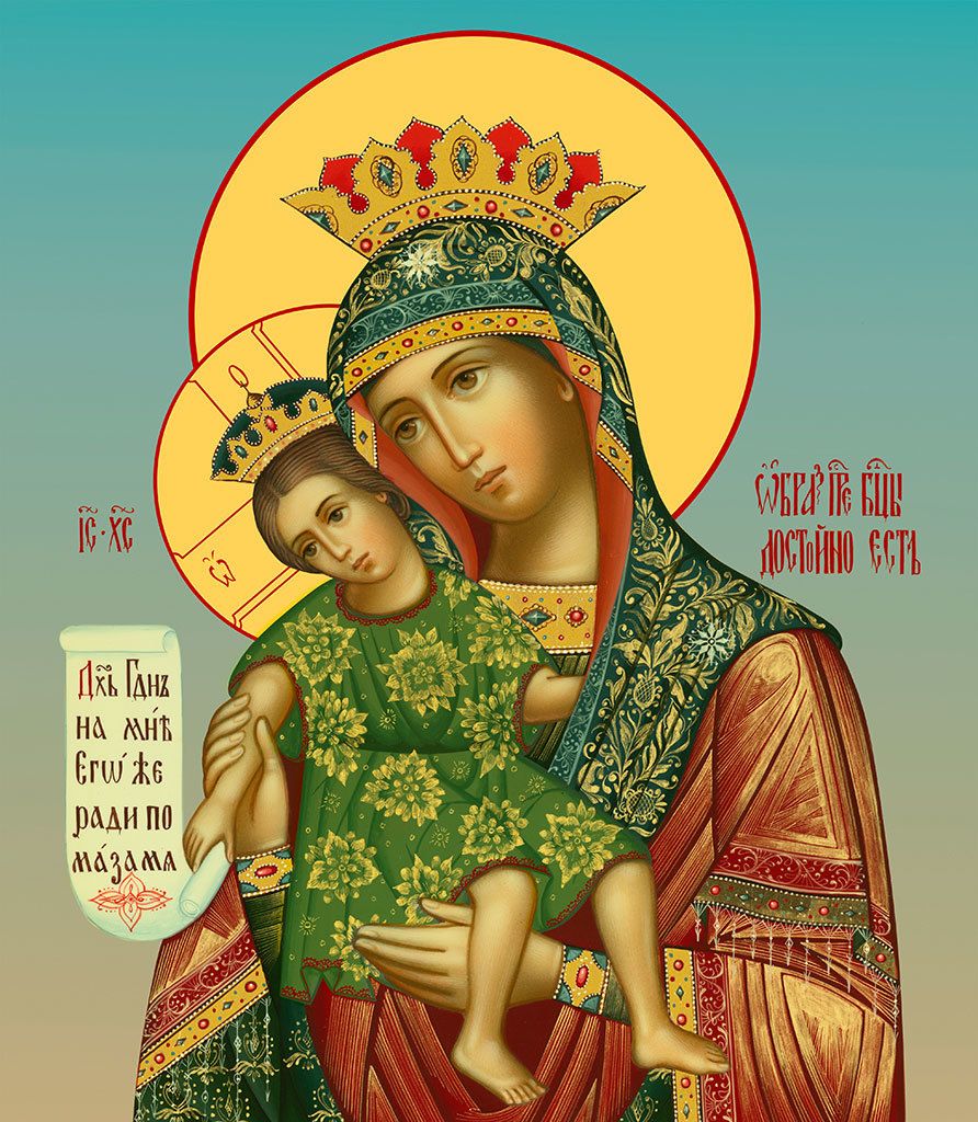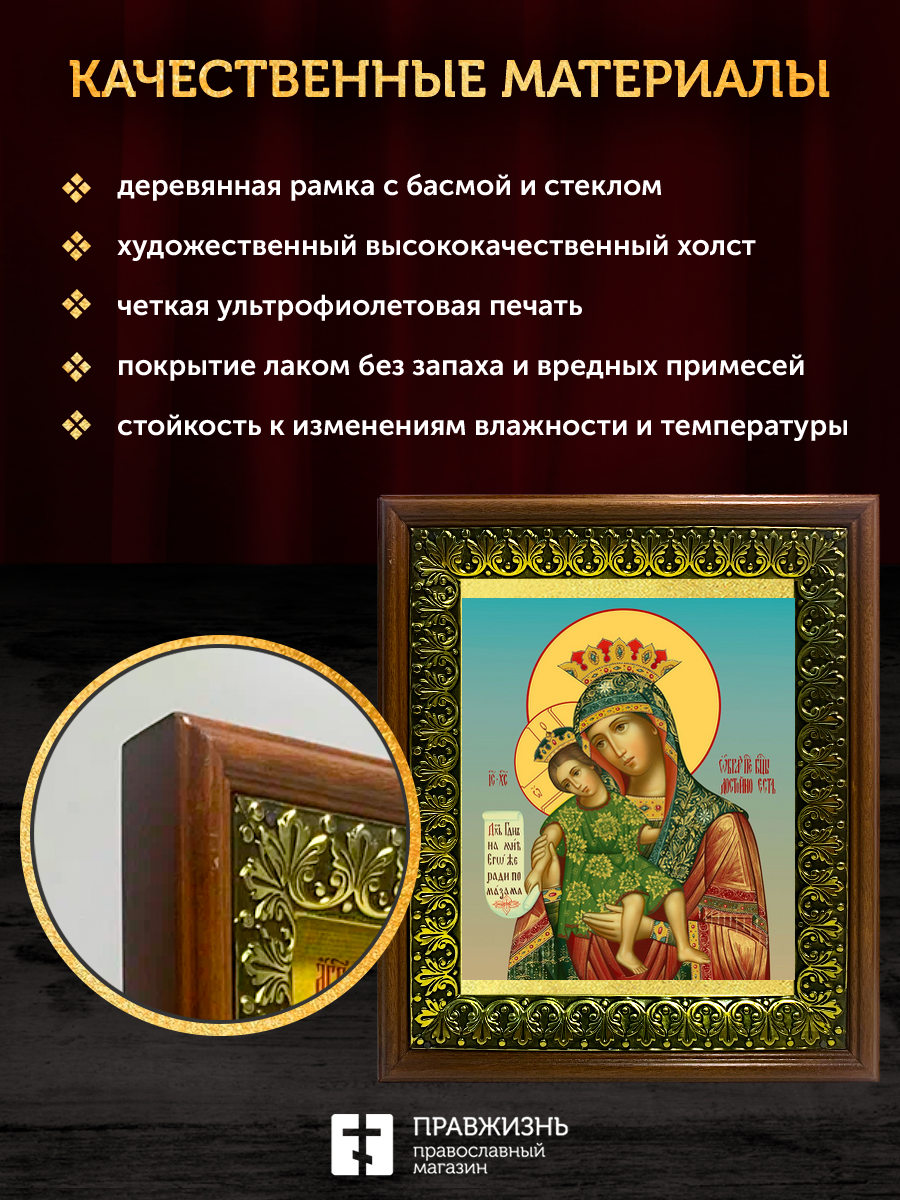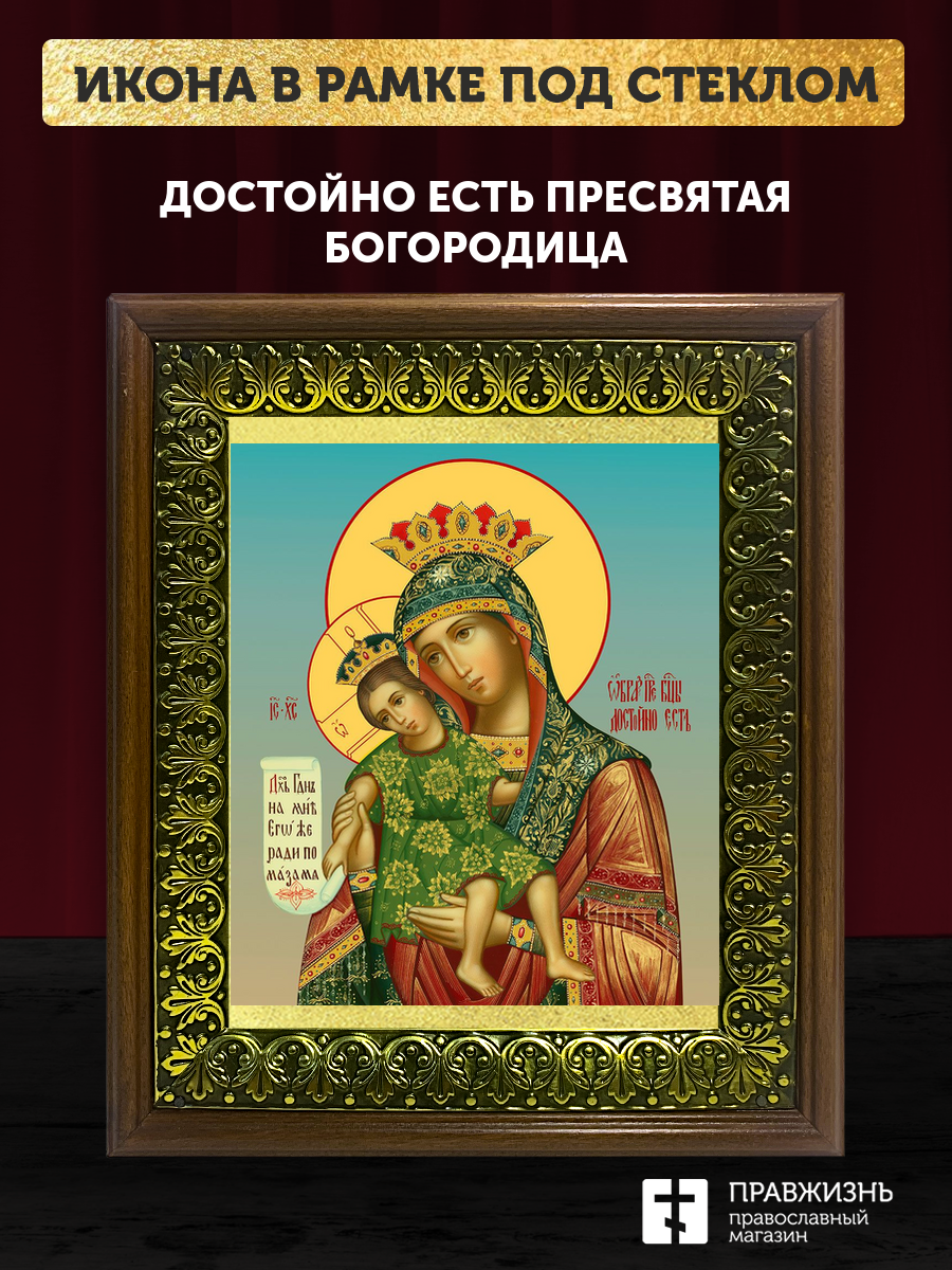 Икона Божией Матери Достойно Есть, деревянная рамка с басмой и стеклом 18х21х2,5 см 1138