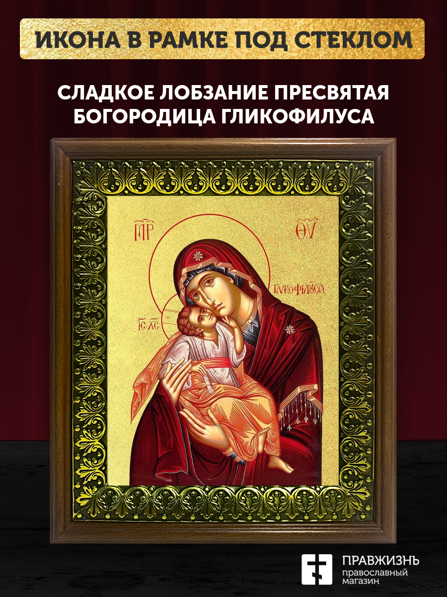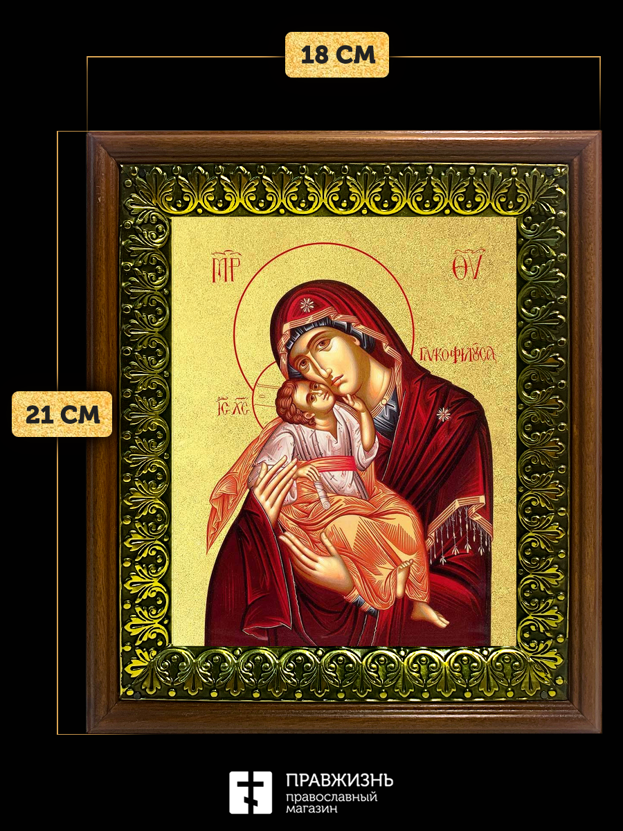 Икона Божией Матери Сладкое Лобзание Гликофилуса с золочением, деревянная рамка с басмой и стеклом 1