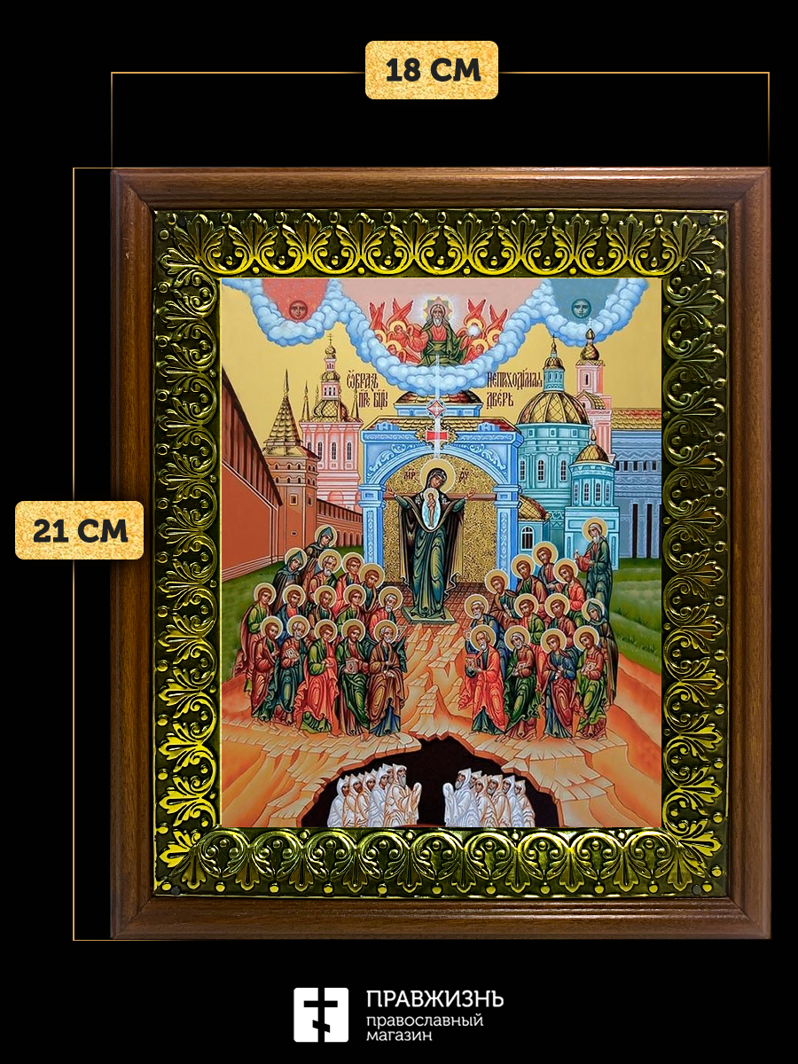 Икона Божьей Матери Непроходимая Дверь, деревянная рамка с басмой и стеклом 18х21х2,5 см 1106