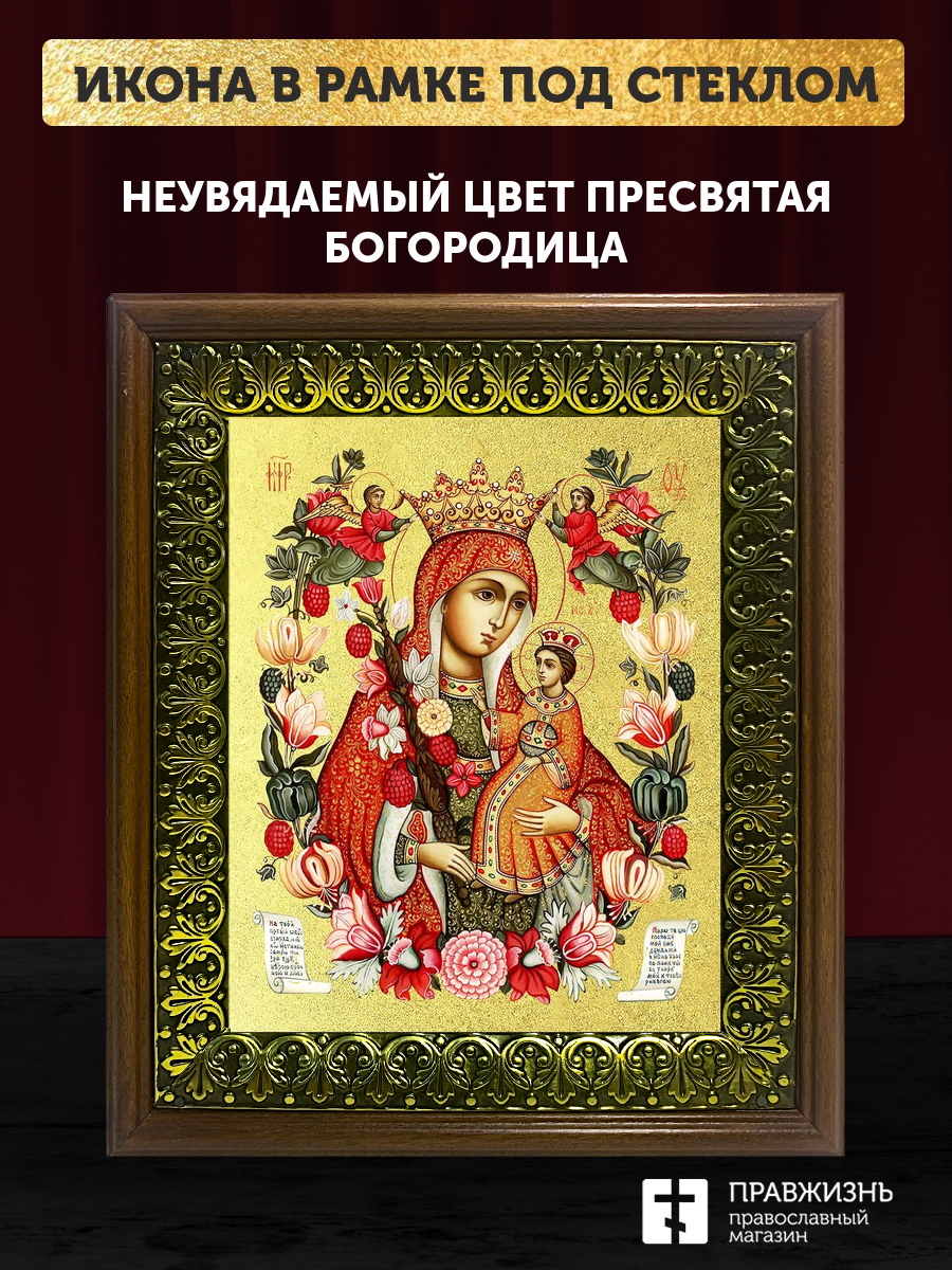 Икона Божией Матери Неувядаемый Цвет с золочением, деревянная рамка с басмой и стеклом 18х21х2,5 см