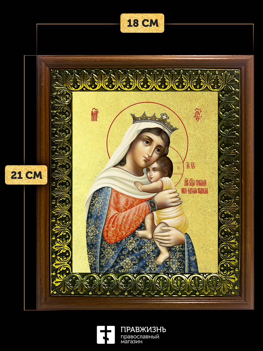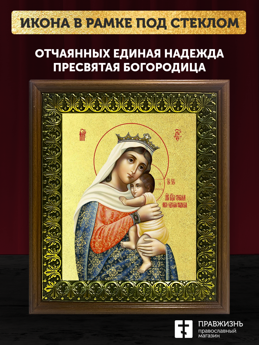 Икона Божией Матери Отчаяных Единая Надежда с золочением, деревянная рамка с басмой и стеклом 18х21х