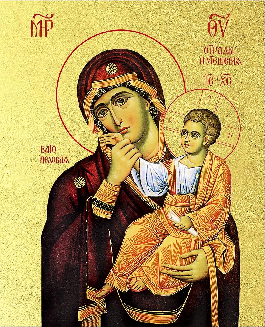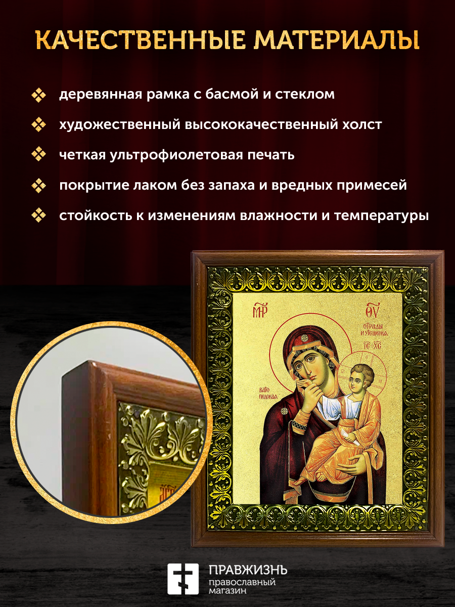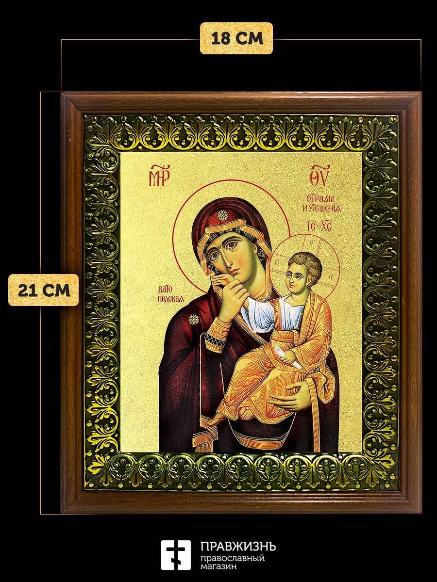 Икона Божией Матери Отрада и Утешение с золочением, деревянная рамка с басмой и стеклом 18х21х2,5 см