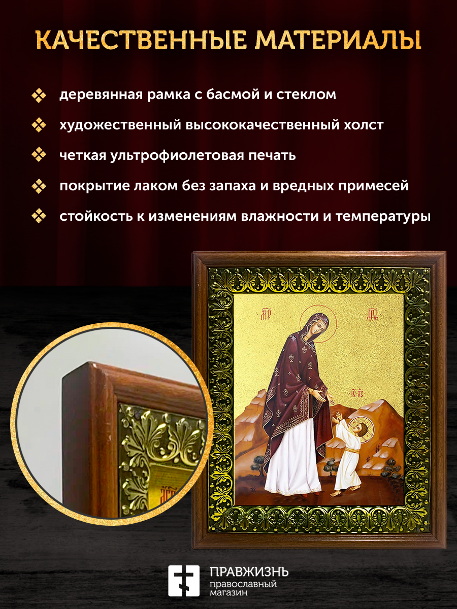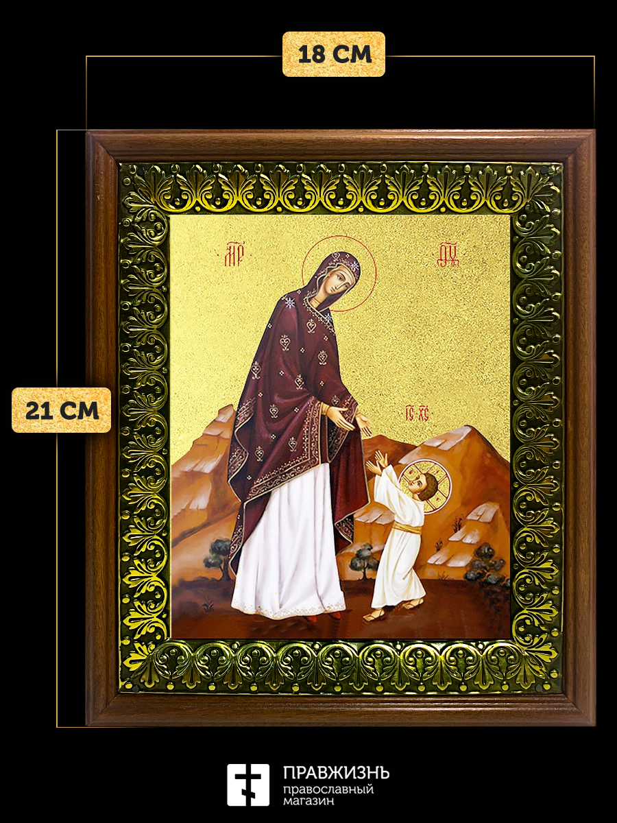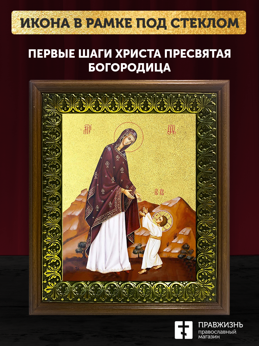 Икона Божией Матери Первые шаги Христа с золочением, деревянная рамка с басмой и стеклом 18х21х2,5 с