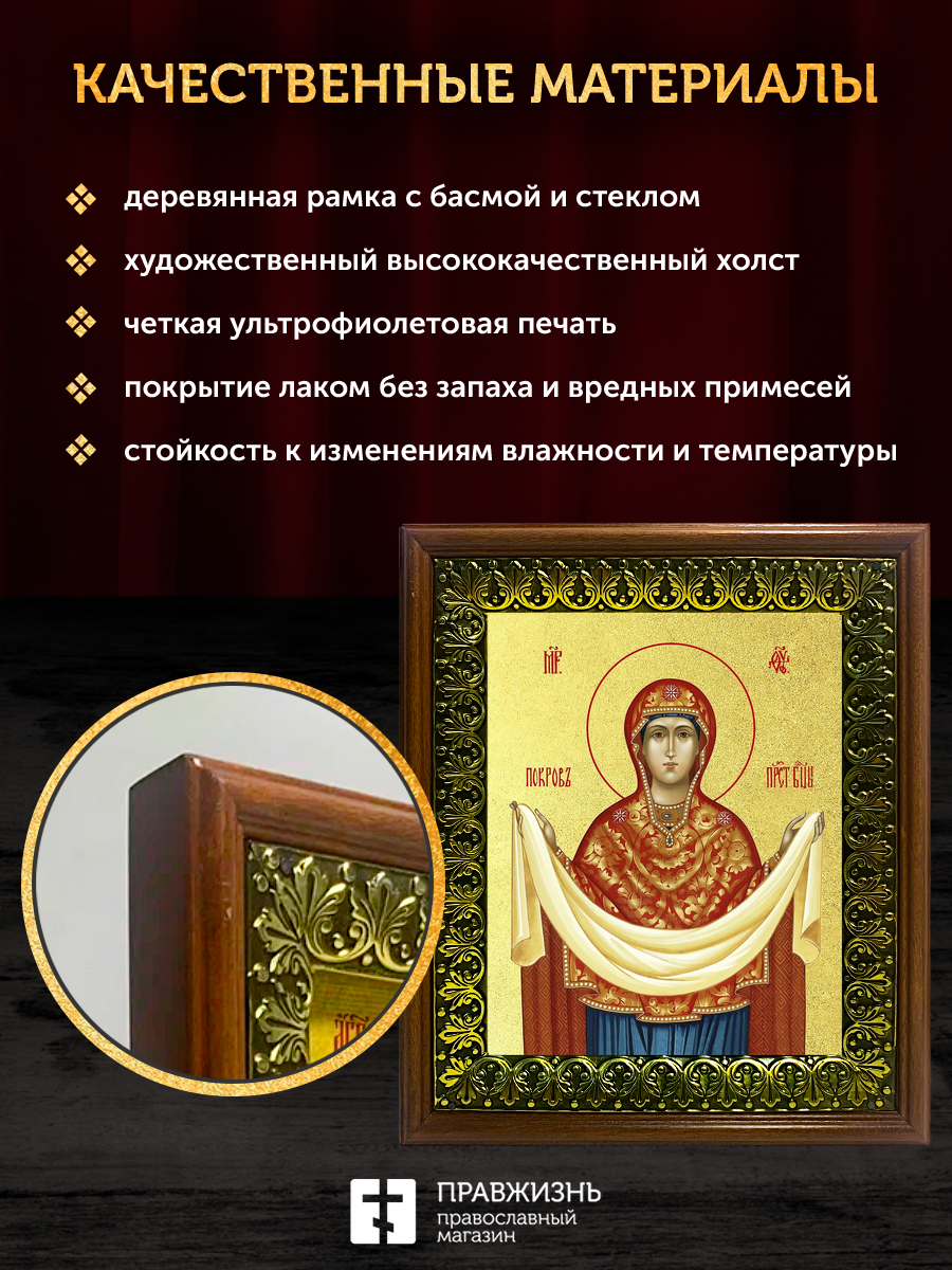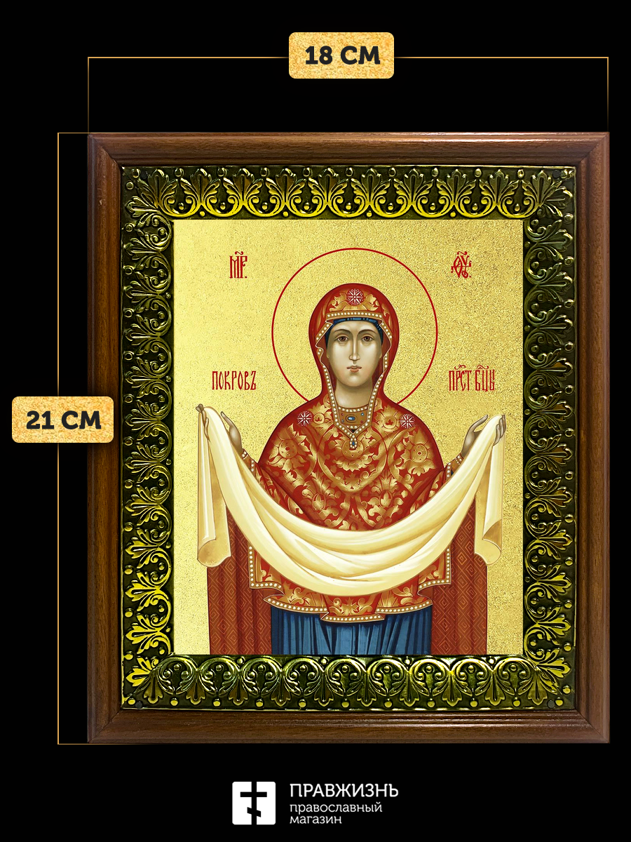 Икона Покров Пресвятой Богородицы с золочением, деревянная рамка с басмой и стеклом 18х21х2,5 см 119