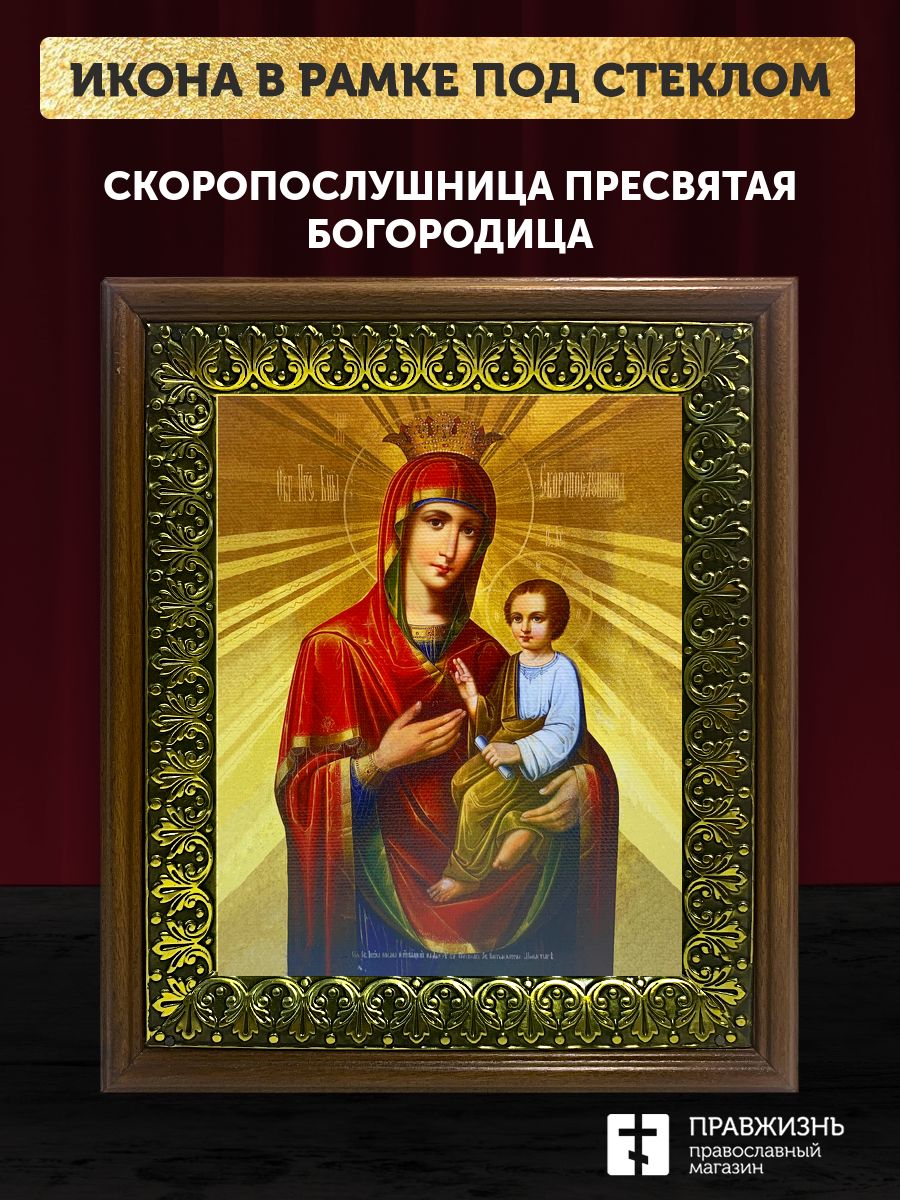 Икона Божией Матери Скоропослушница, деревянная рамка с басмой и стеклом 18х21х2,5 см 132