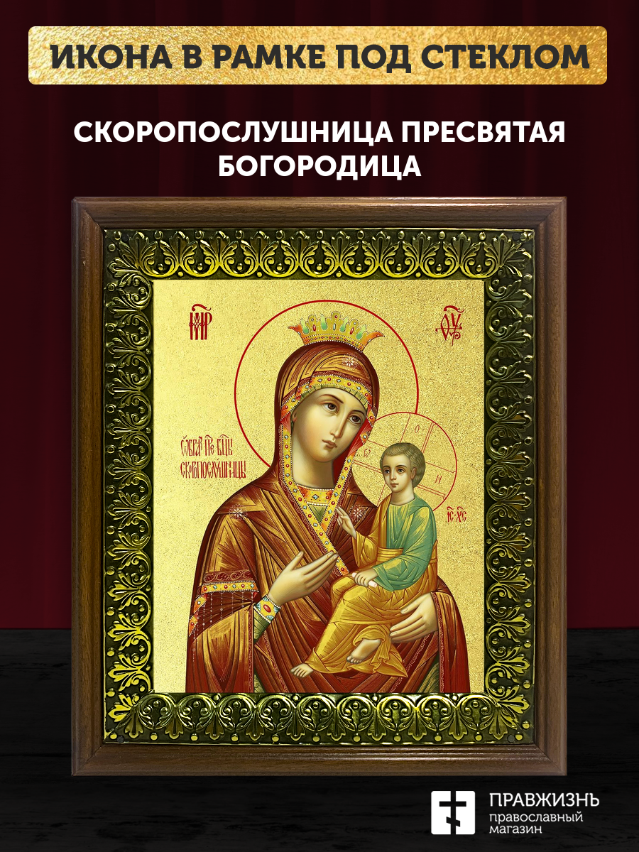 Икона Божией Матери Скоропослушница с золочением, деревянная рамка с басмой и стеклом 18х21х2,5 см 1