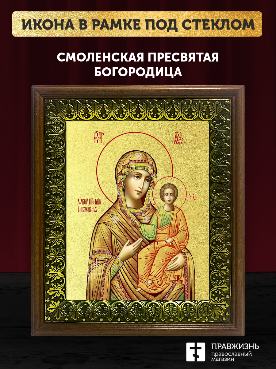 Икона Божией Матери Смоленская с золочением, деревянная рамка с басмой и стеклом 18х21х2,5 см 133