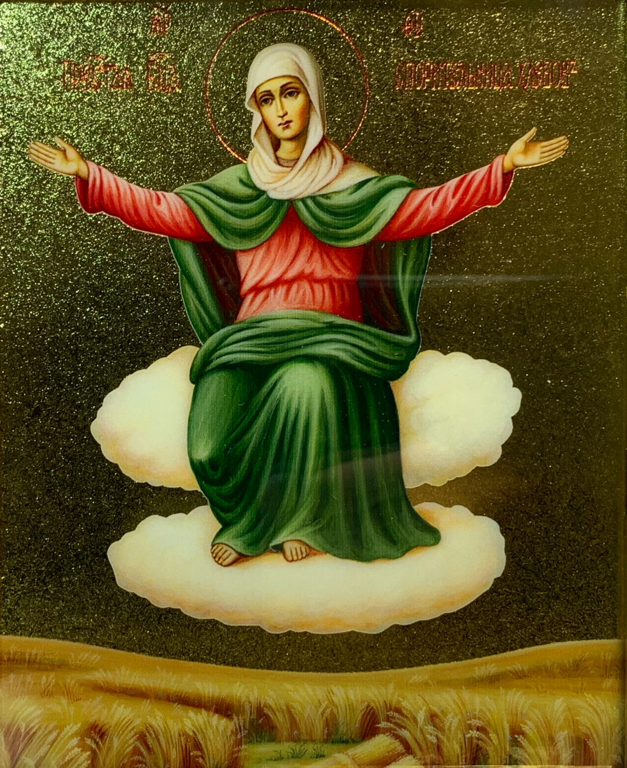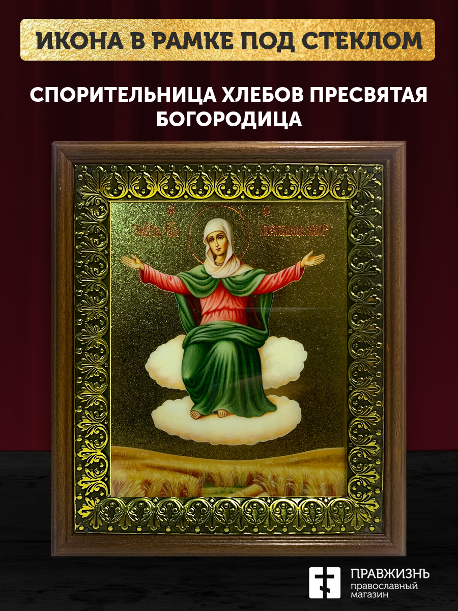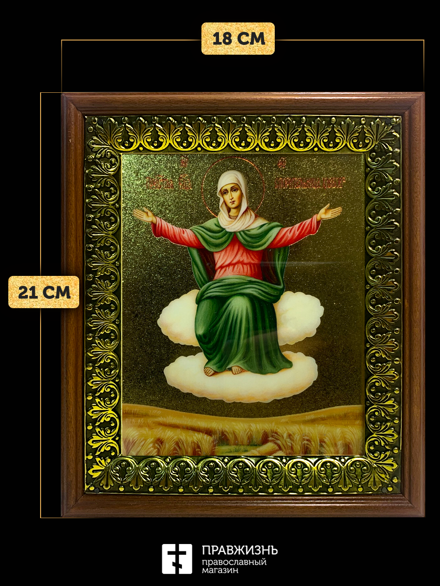 Икона Божией Матери Спорительница хлебов с золочением, деревянная рамка с басмой и стеклом 18х21х2,5