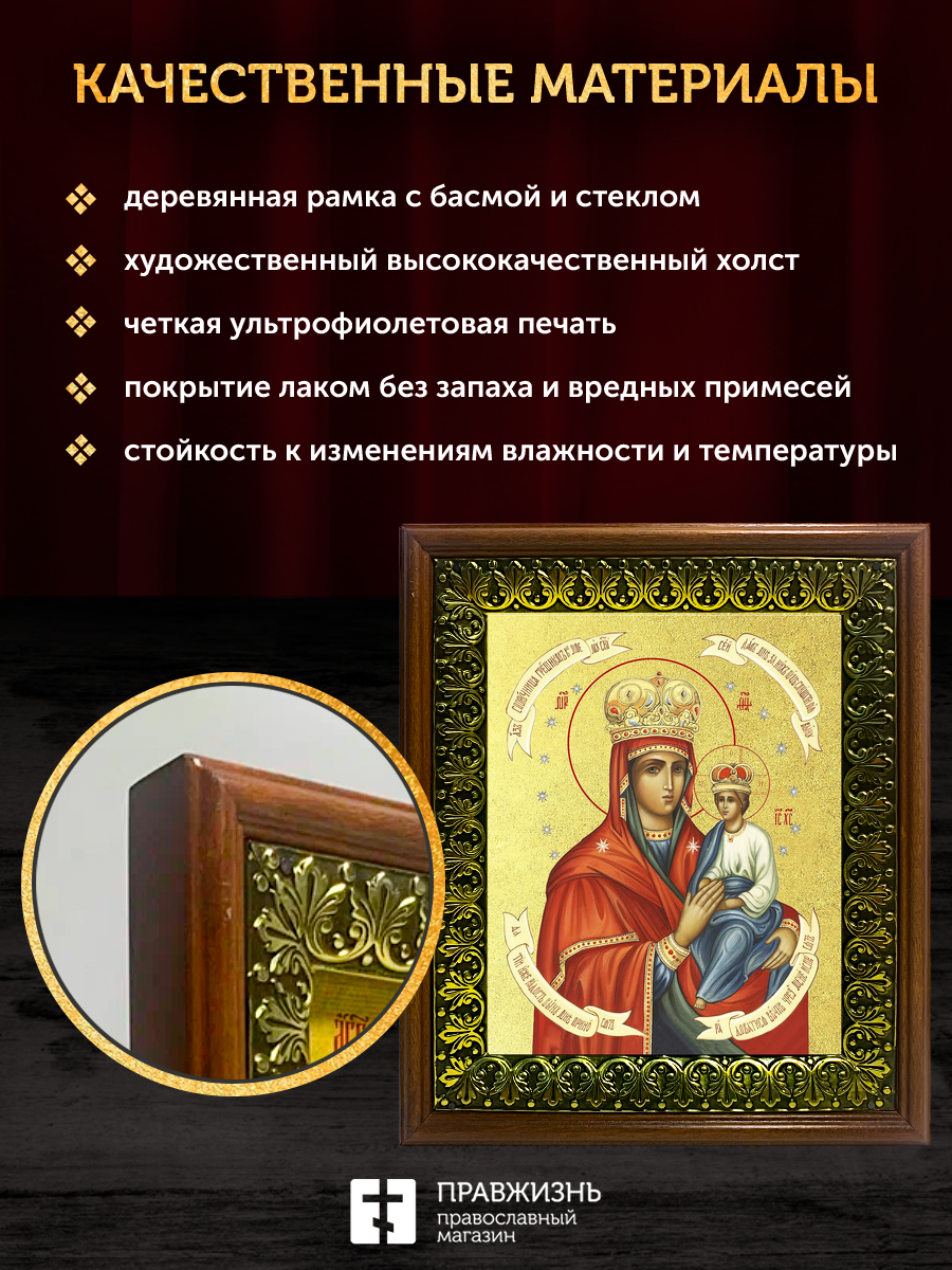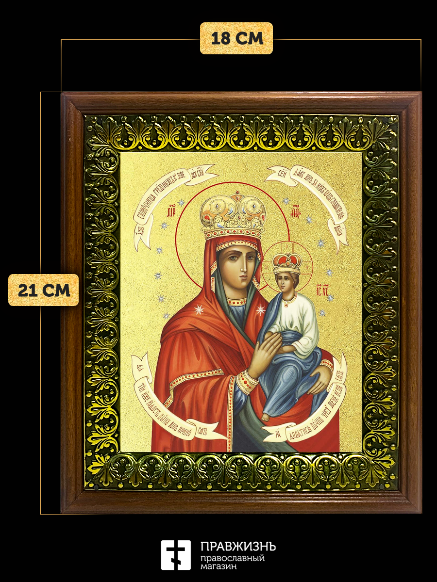 Икона Божией Матери Споручница грешных с золочением, деревянная рамка с басмой и стеклом 18х21х2,5 с
