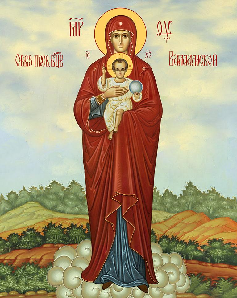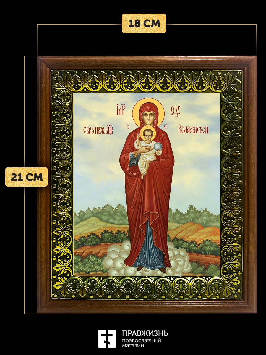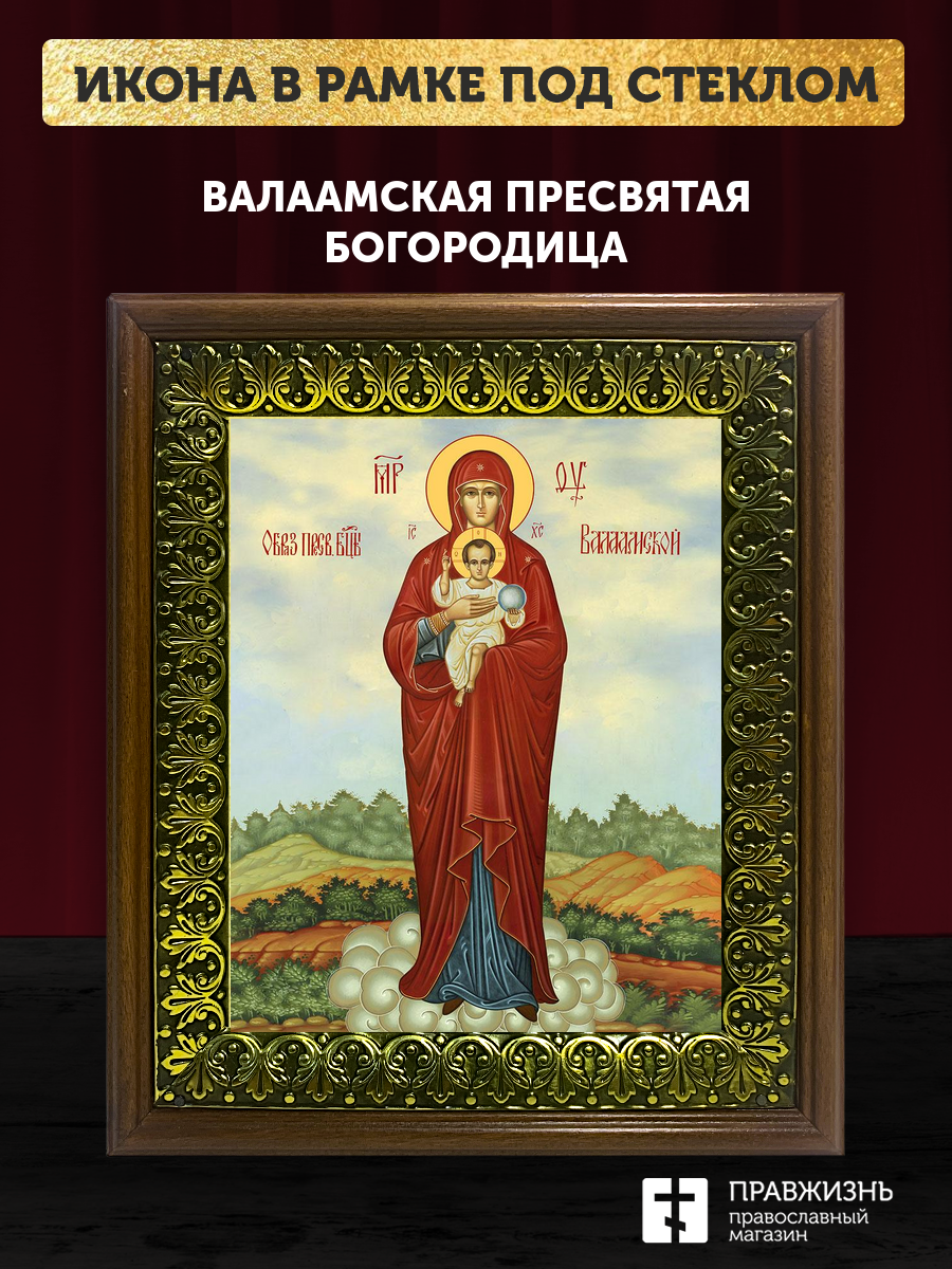 Икона Божией Матери Валаамская, деревянная рамка с басмой и стеклом 18х21х2,5 см 1185