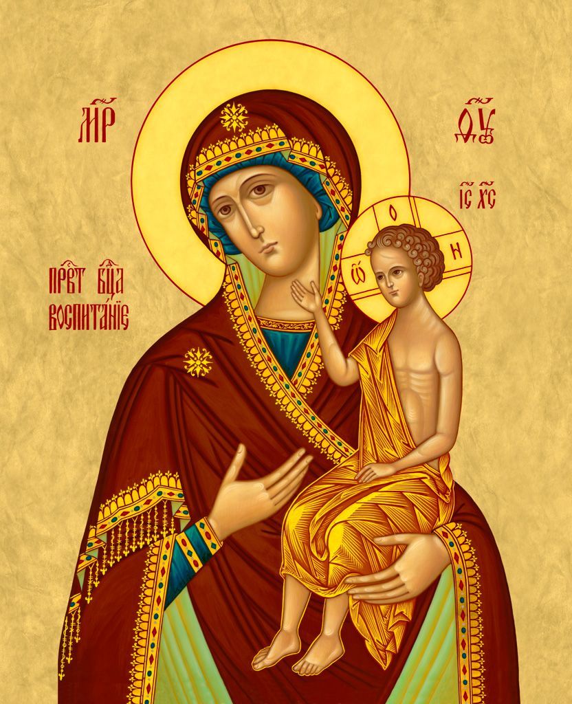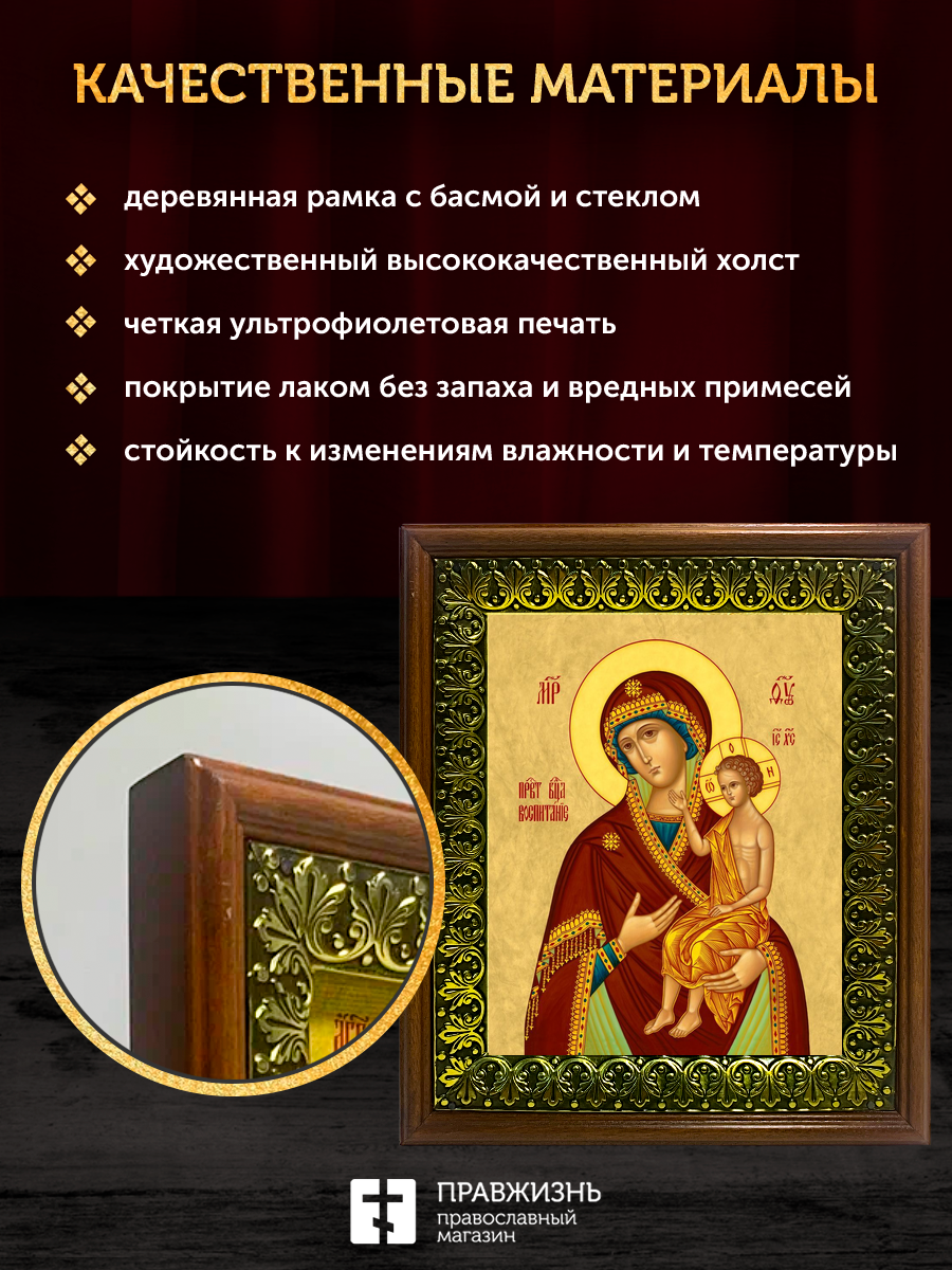 Икона Божией Матери Воспитание, деревянная рамка с басмой и стеклом 18х21х2,5 см 1171