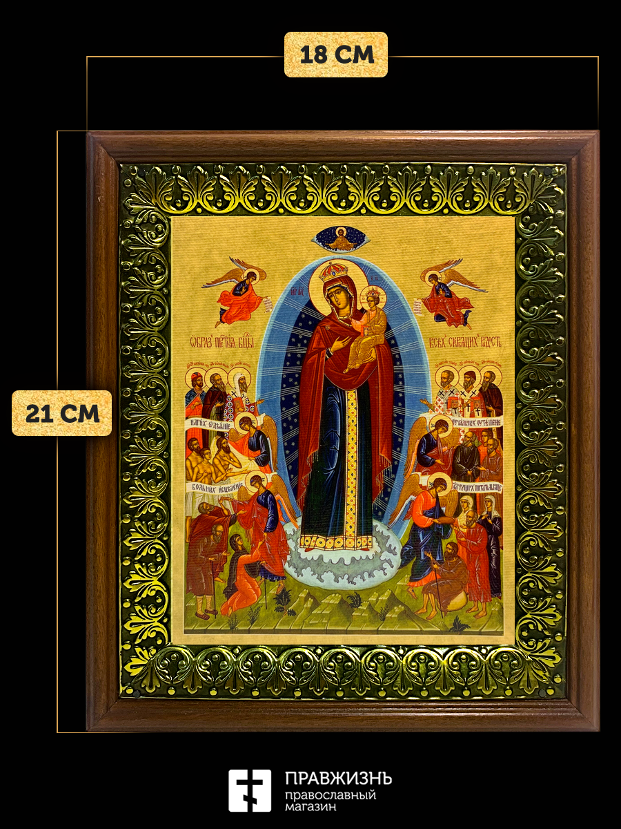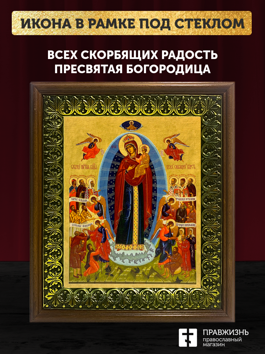 Икона Божией Матери Всех Скорбящих Радость, деревянная рамка с басмой и стеклом 18х21х2,5 см 153