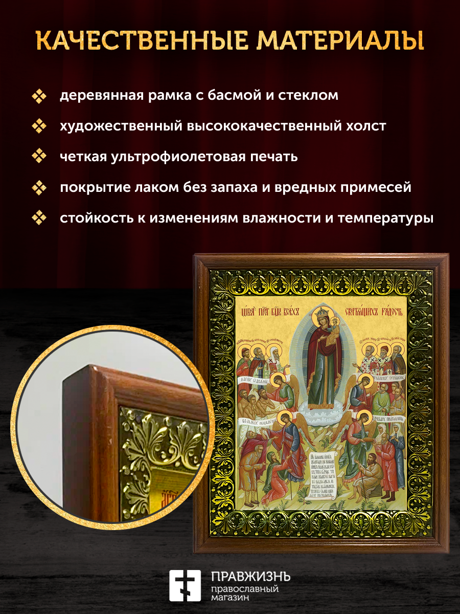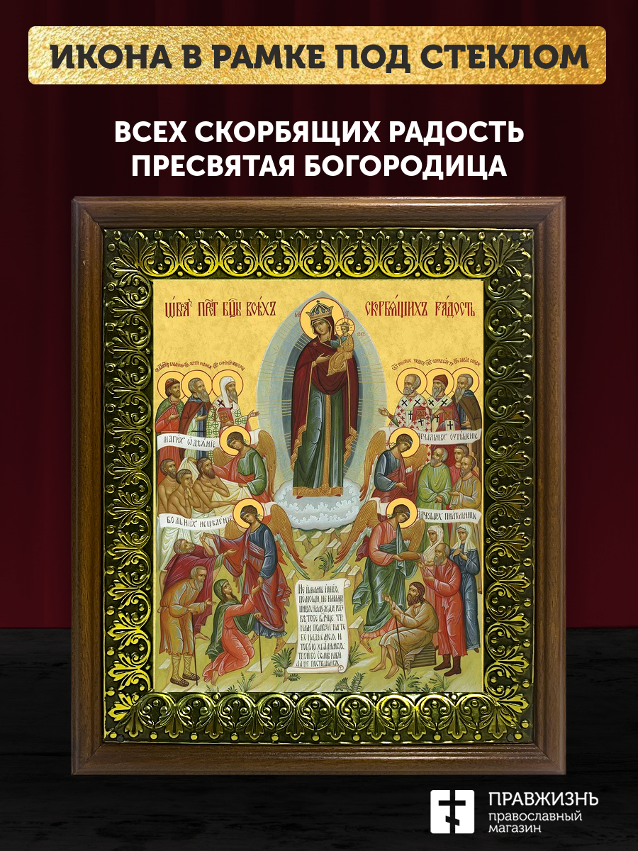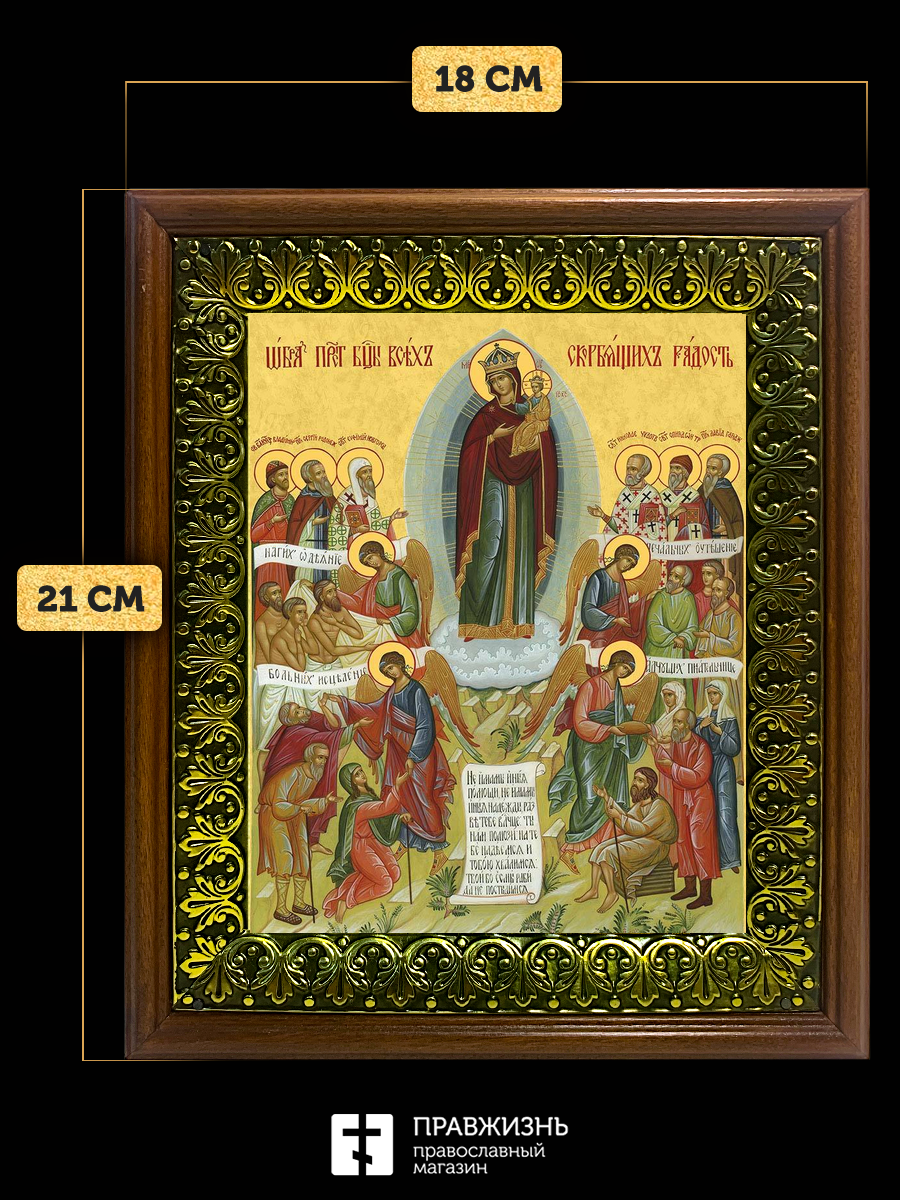 Икона Божией Матери Всех Скорбящих Радость, деревянная рамка с басмой и стеклом 18х21х2,5 см 153