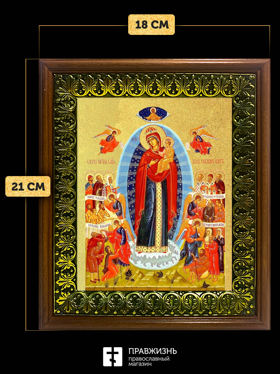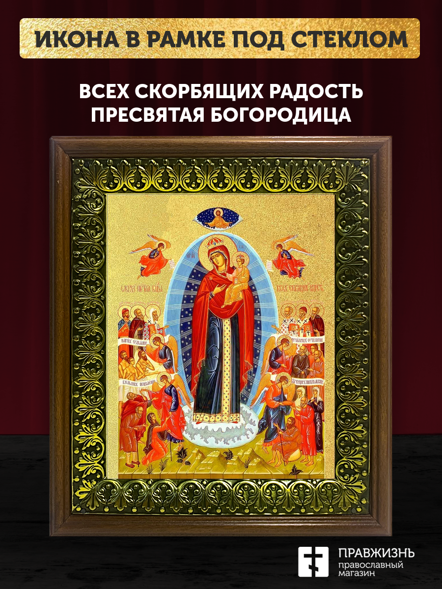 Икона Божией Матери Всех скорбящих Радость с золочением, деревянная рамка с басмой и стеклом 18х21х2