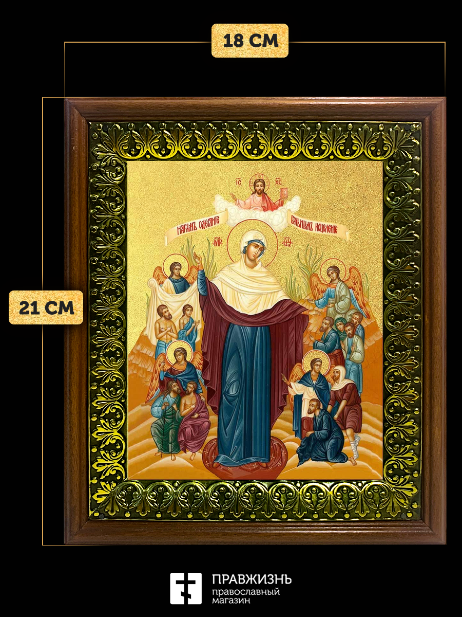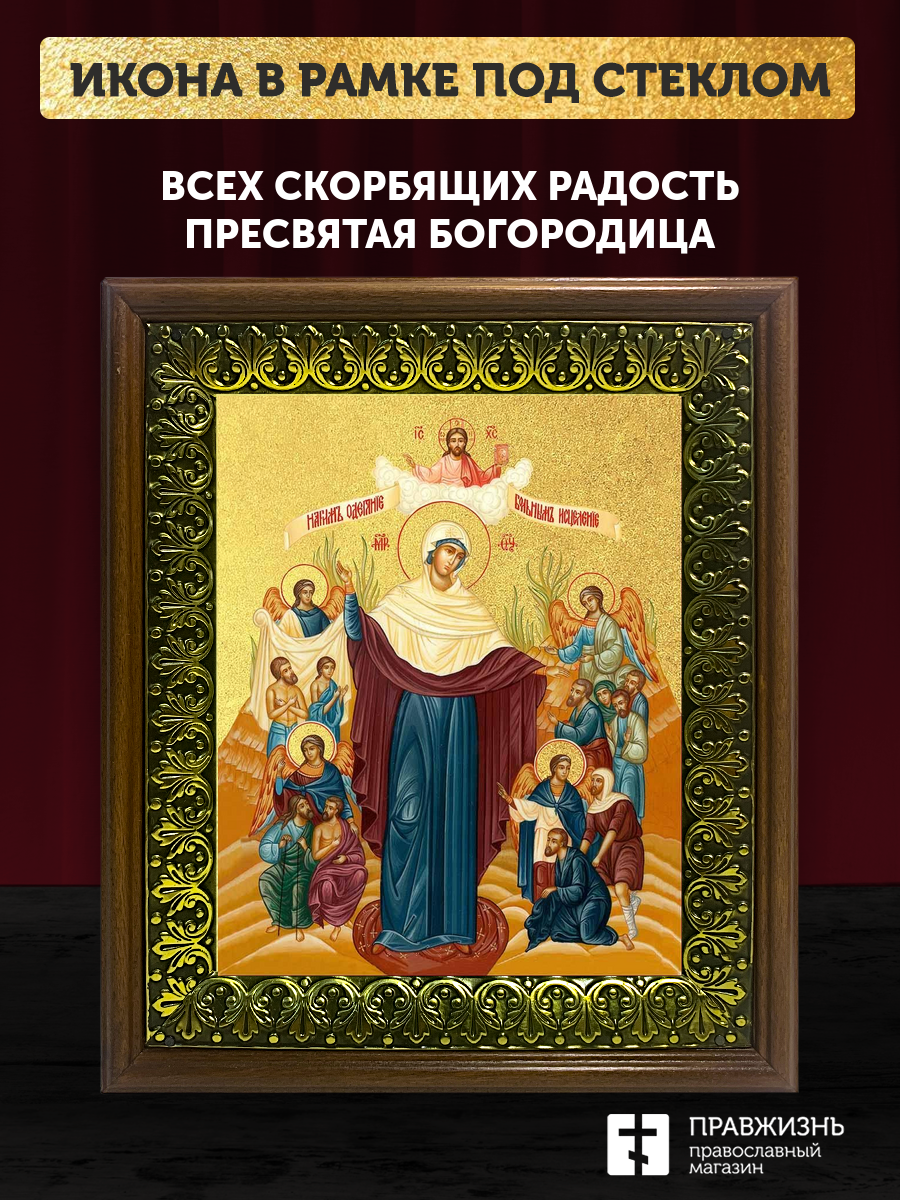 Икона Божией Матери Всех скорбящих Радость с золочением, деревянная рамка с басмой и стеклом 18х21х2