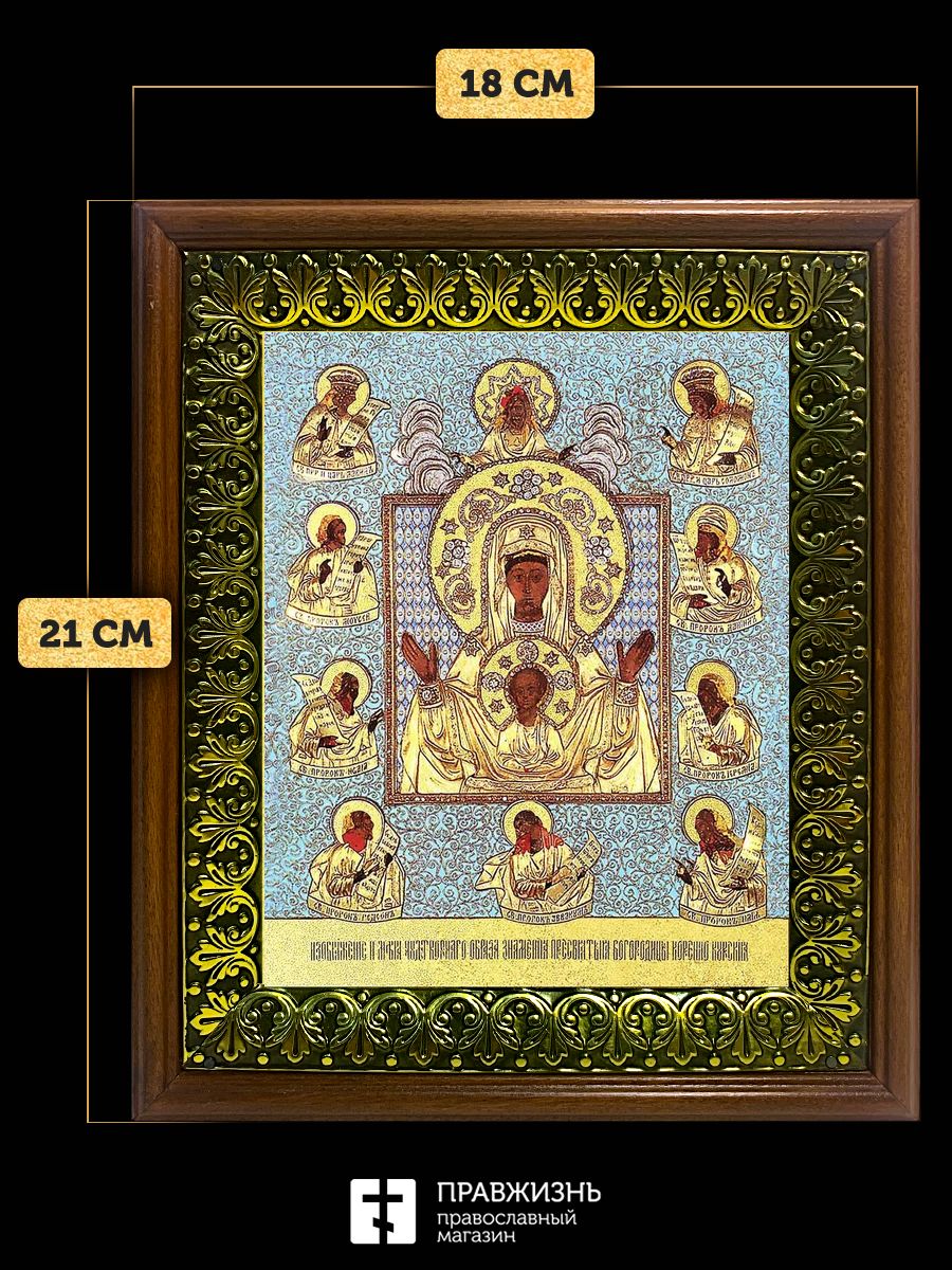 Икона Божией Матери Знамение Курская-Коренная с золочением, деревянная рамка с басмой и стеклом 18х2