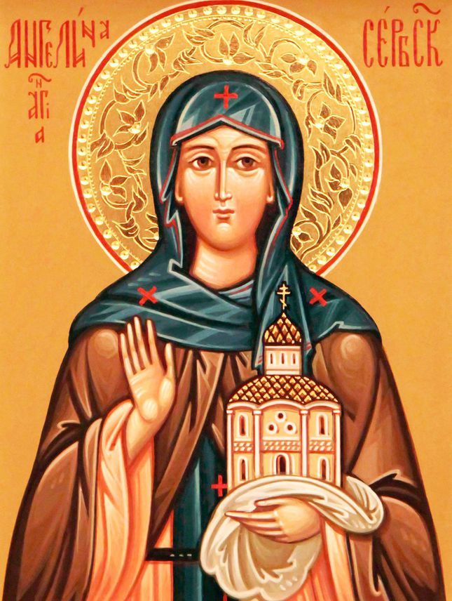 Дочь князя Георгия Албанского и супруга Стефана, короля Сербии, святая Ангелина претерпела изгнание вместе со своим мужем и разделила все трудности жизни в Албании и Италии. Двух сыновей своих, святых Максима и Иоанна, воспитала в духе истинно христианском. По смерти супруга, приняв монашеский постриг, святая Ангелина посвятила себя молитве, благотворительности и храмостроительству. Верная жена, добрая мать и совершенная христианка, она воистину заслужила имя «матери Ангелины», которым ее наградил народ. Ее чудотворные мощи сохраняются вместе с мощами ее праведного супруга – святого Стефана и их благочестивых детей Максима и Иоанна в монастыре Крушедол. Святая Ангелина обрела покой и вечную жизнь в начале шестнадцатого столетия.
