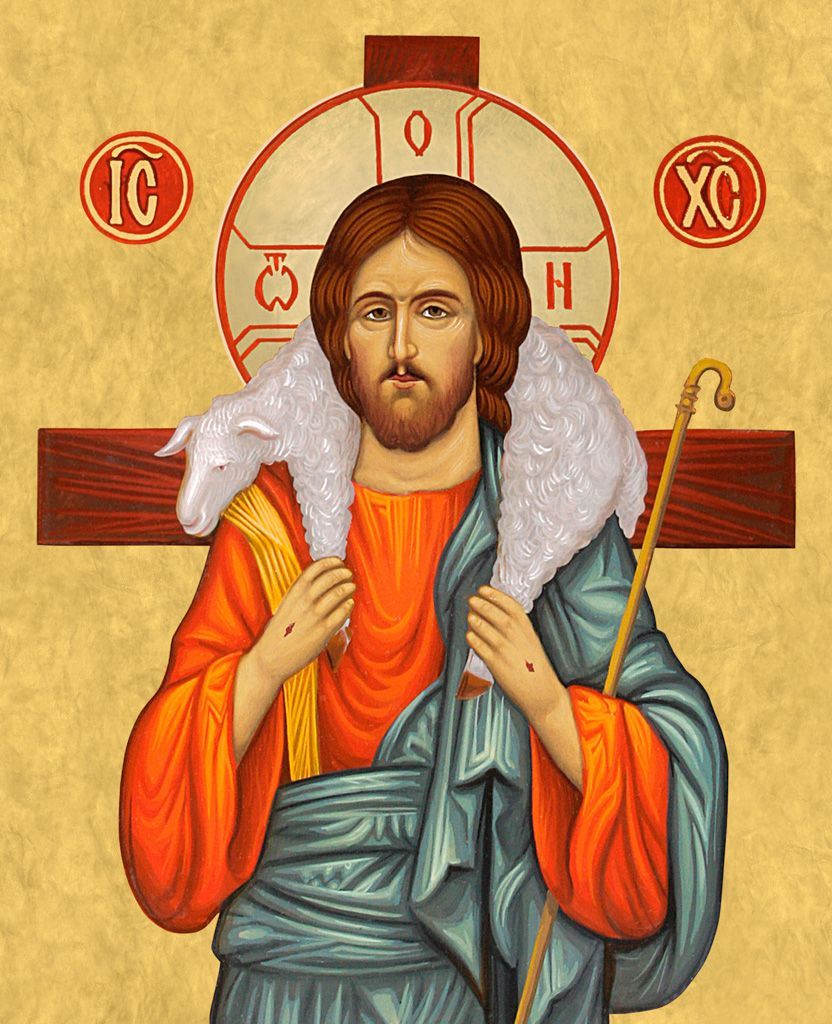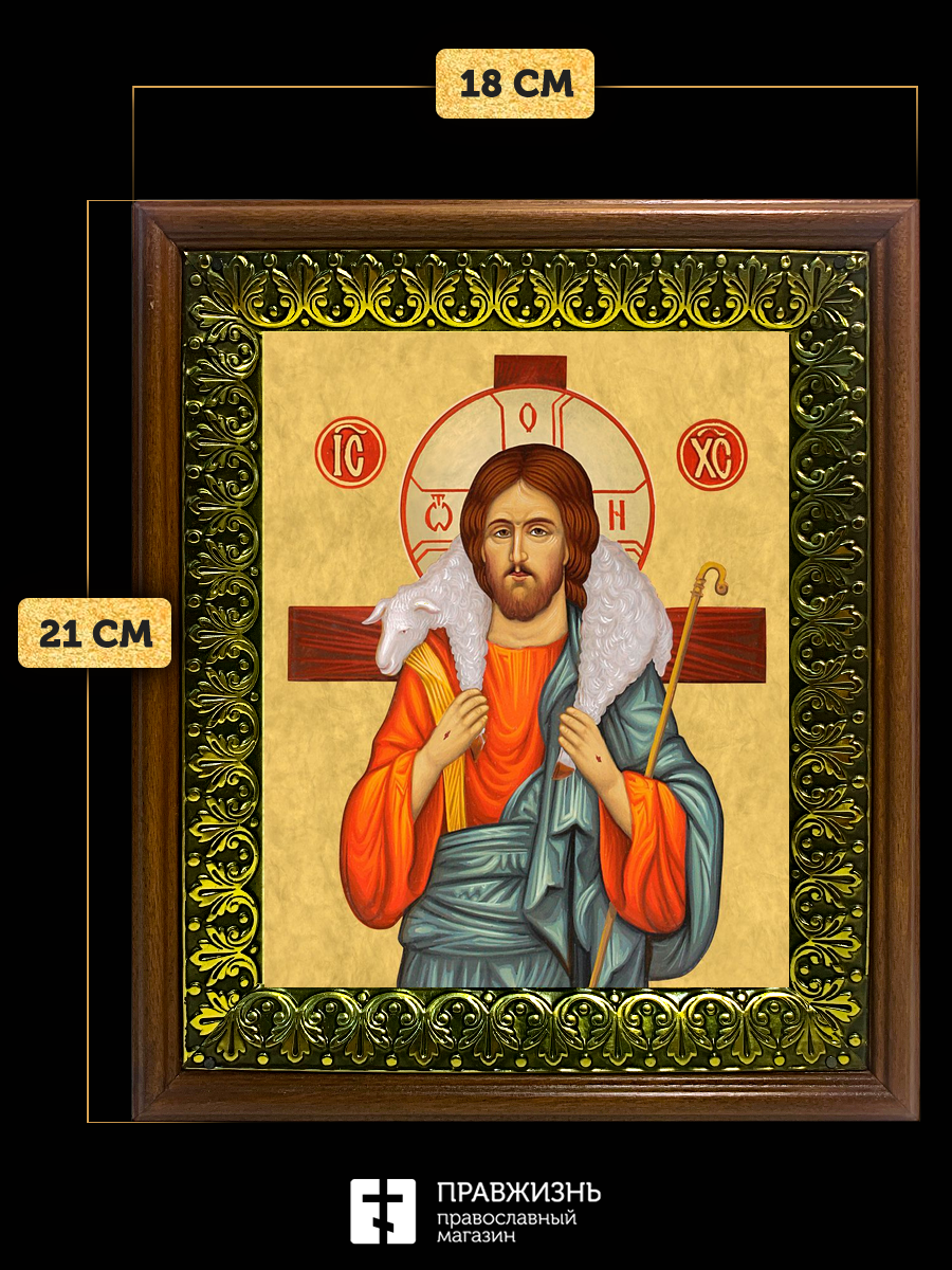 Икона Пастырь добрый Господь Иисус Христос, деревянная рамка с басмой и стеклом 18х21х2,5 см