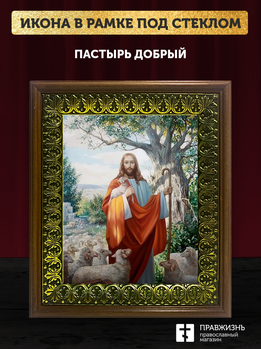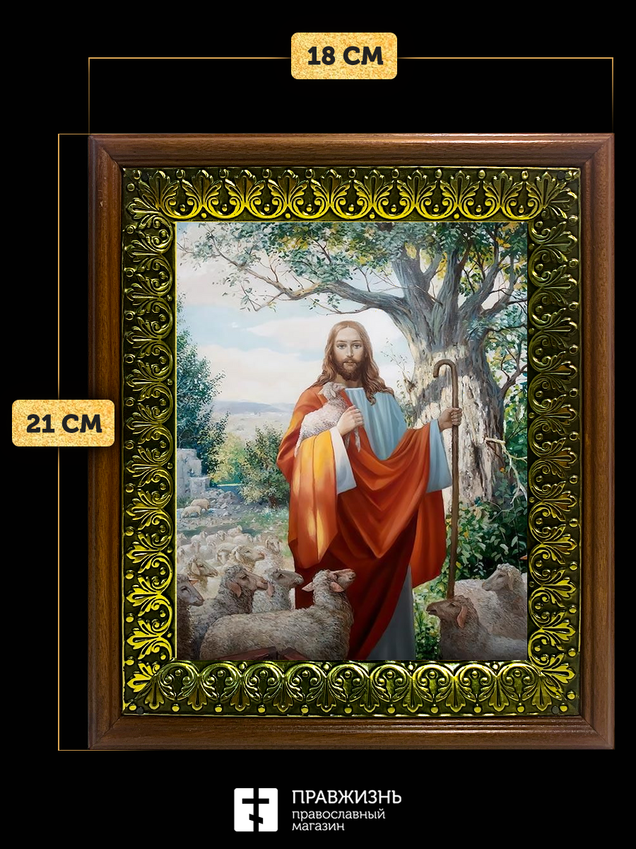 Икона Пастырь добрый Господь Иисус Христос, деревянная рамка с басмой и стеклом 18х21х2,5 см