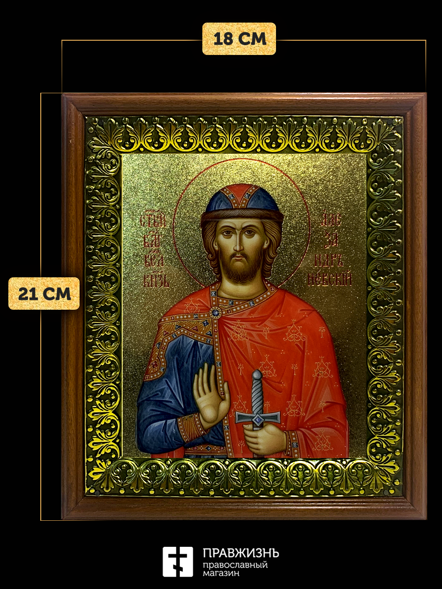 Икона Александр Невский благоверный князь с золочением, деревянная рамка с басмой и стеклом 18х21х2,