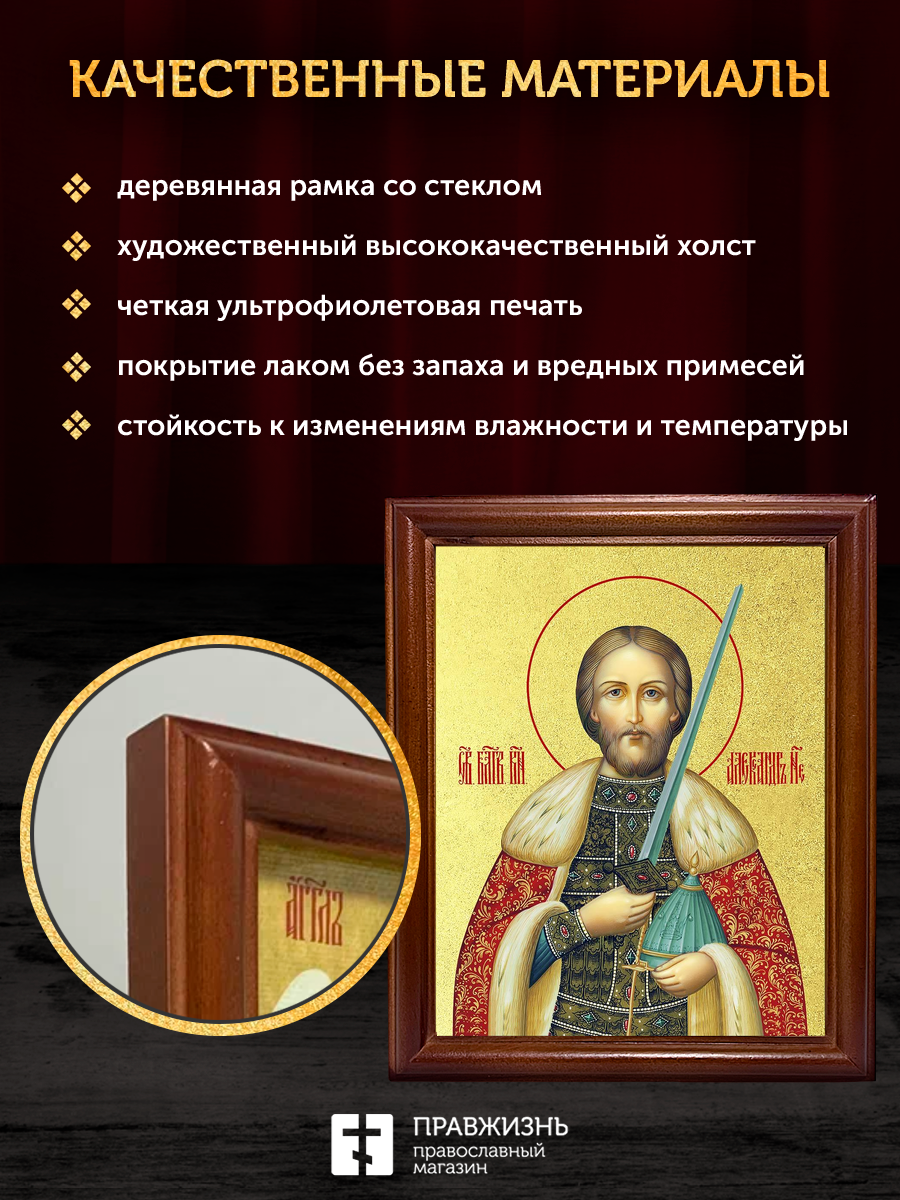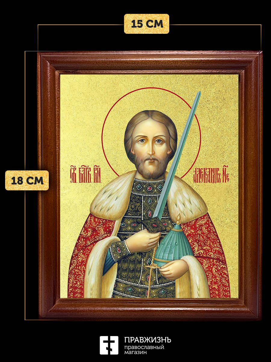 Икона Александр Невский благоверный князь с золочением, деревянная рамка со стеклом 15х18х2 см 020