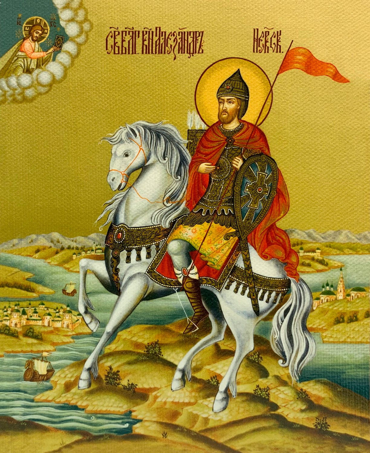 Именная икона Александр Невский Благоверный Князь на коне на холсте в киоте 020 09002_KRA