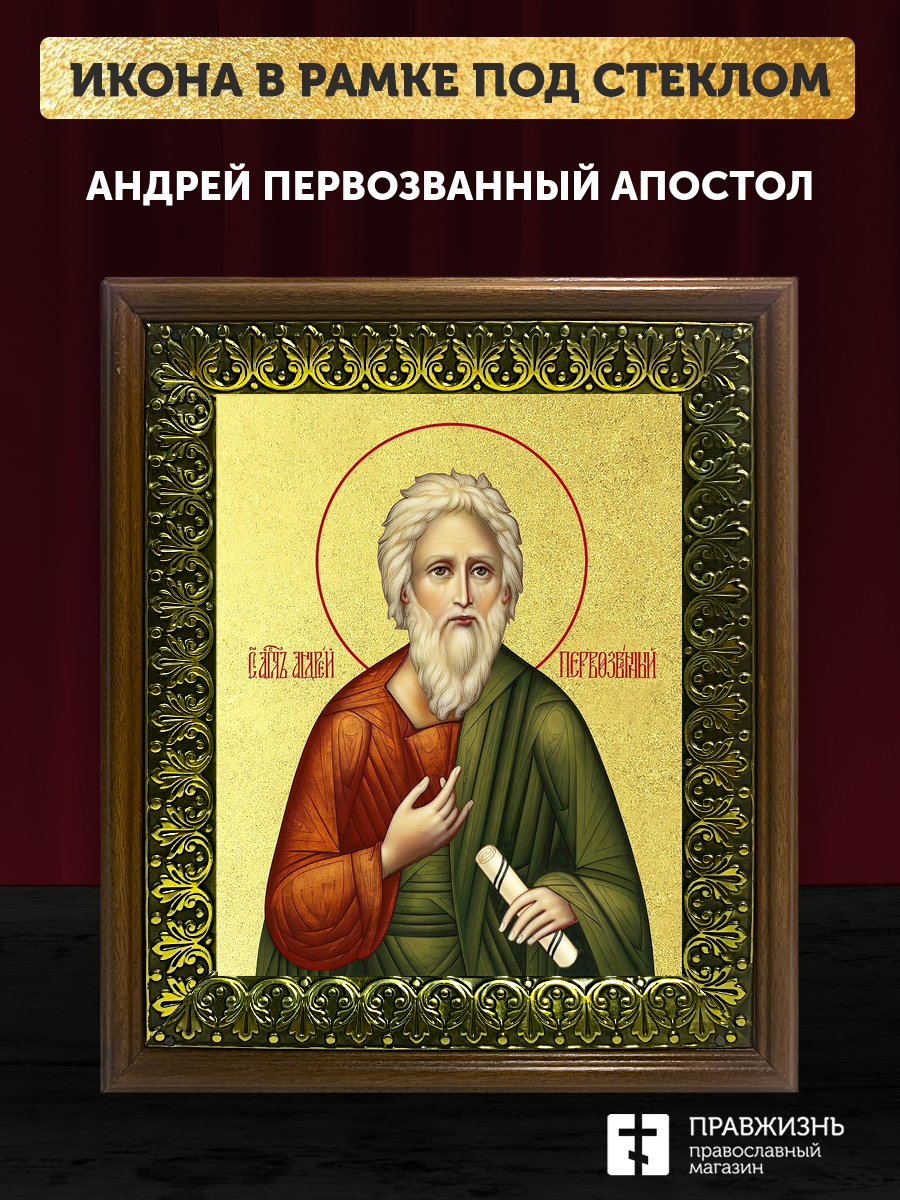 Икона Андрей Первозванный апостол с золочением, деревянная рамка с басмой и стеклом 18х21х2,5 см 027