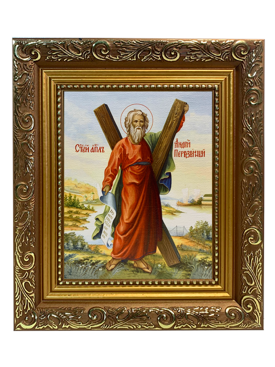 Икона Андрей Первозванный Апостол с крестом на холсте в киоте 027