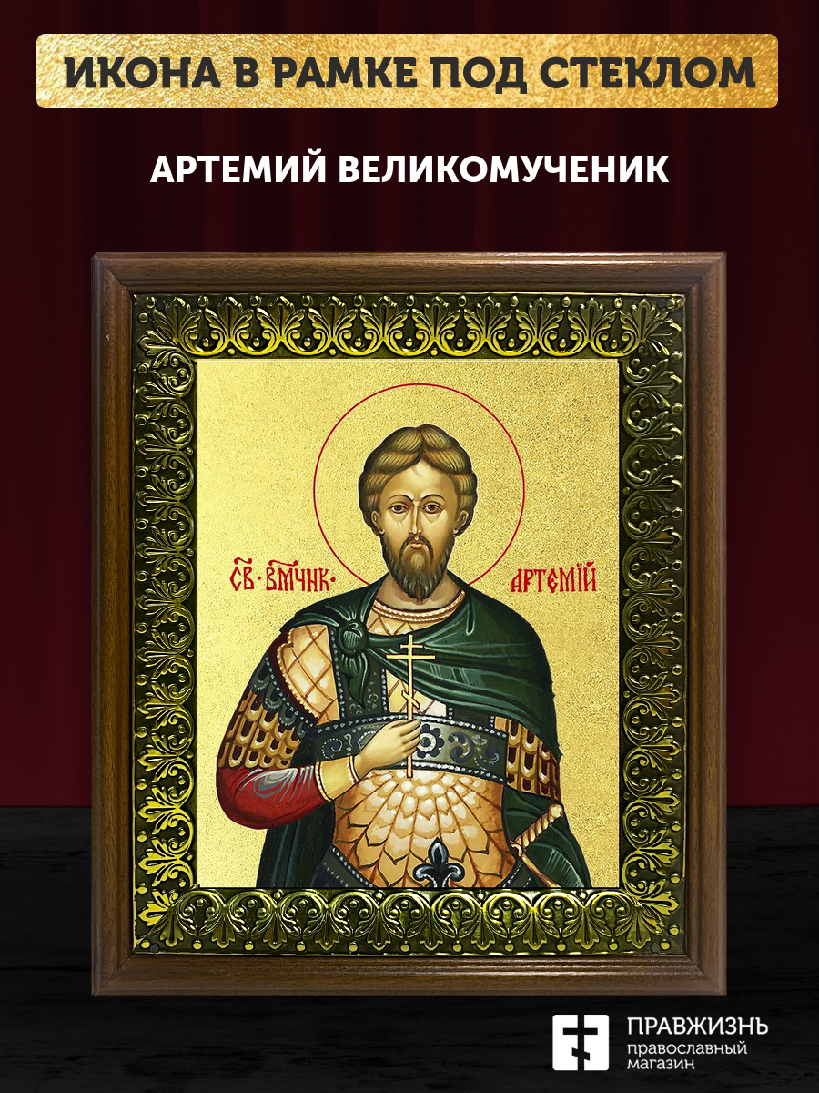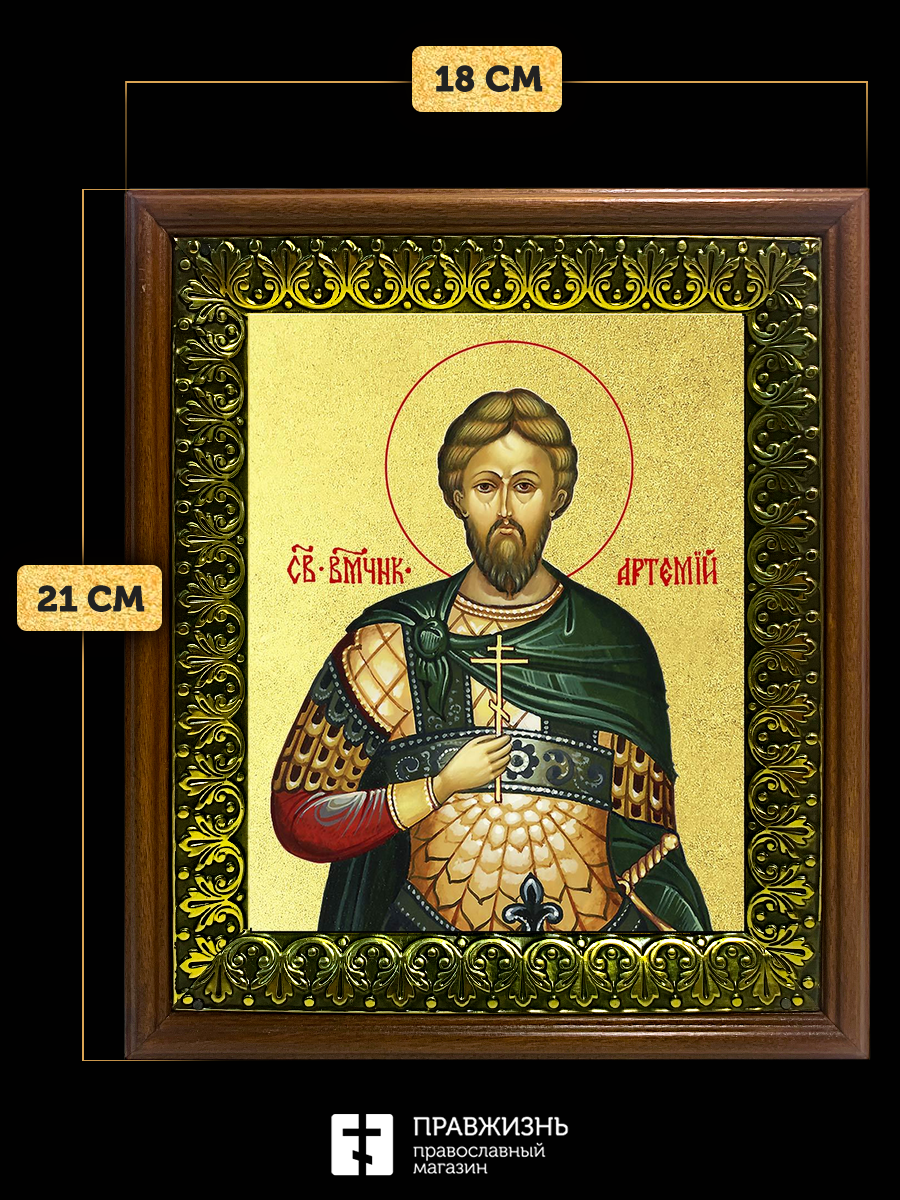 Икона Артемий великомученик с золочением, деревянная рамка с басмой и стеклом 18х21х2,5 см 349